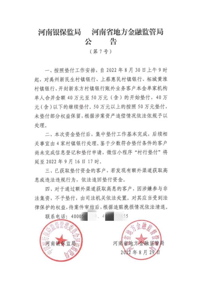 7号公告来了,信息量有点大,这也是村行垫付末了一次公告,垫付资金40万至50万,特殊注意的是50万以上的合法储户也按50万先行垫付,剩余未垫付部分根据追赃挽损返来的资金决定垫付比列,后续变乱由各自对应的银行处理处罚。 也就是说部分储户还得继承与禹州新民生、柘城黄淮、开封新东方、上蔡惠民村镇银行关联上,村行垫付小步伐也将于2022年9月16日17点关闭,村行垫付也顺遂完成了它的使命。陪同40万储户取出了200多亿的资金。 陪同储户度过了舒畅的两个月,为什么说舒畅呢?由于那里可以取出自己的存款。也是存款合浦珠还的地方,以是无论怎样还是感谢村行垫付。同时渴望能追回更多的资金,给那些百万万万的大户只管多的回款。 |