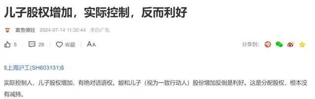 非离不可吗? 作者 | 武丽娟 张凯旌 编辑丨高岩 泉源 | 野马财经 古稀之年还要仳离,究竟图什么? 时隔9个月后,上海沪工(603131.SH)实控人仳离诉讼案落槌。7月12日晚间的公告表现,实控人舒宏瑞和缪莉萍两边已清除婚姻关系,并就仳离产业分割事件作出相关安排。舒宏瑞应于7月30日之前将其持有的公司3970.75 万股股票(占公司总股本的 12.49%)过户至缪莉萍名下。而舒宏瑞及缪莉萍目前已经73岁、72岁高龄。 客岁以来,A股“天价仳离案”屡见不鲜,包括三六零(601360.SH)、邦彦技能(688132.SH)、国光股份(002749.SZ)等在内,已有超十家上市公司发布实控人夫妇因仳离产生股权分割的公告。此中不少是AI板块的牛股,这也导致部门股民已经“谈仳离色变”。 上海沪工是国内规模最大的焊接与切割装备制造商之一。二级市场上,上海沪工3月中上旬股价一度到达19.08元/股,停止7月15日收盘已降至12.43元/股,跌幅约为34%。 “分手费”超5亿元儿子成控股股东2023年10月18日,上海沪工曾发布公告,舒宏瑞因个人原因向上海市徐汇区人民法院提告状请,要求判令其与缪莉萍清除婚姻关系,并进行产业分割。彼时,舒宏瑞、缪莉萍、舒振宇在上海沪工的持股比例分别为21.07%、6.81%和18.43%,三人皆是公司实控人。 7月13日,上海沪工公告称,经法院调解,夫妇俩顺遂告竣仳离诉求,舒宏瑞应在2024 年7月30日之前将其持有的公司 3970.75万股股票过户至前妻名下。本次权益变更后,缪莉萍持有6135.85万股公司股份,占公司总股本的19.3%。 按公告日7月12日上海沪工收盘价13.38元盘算,上述股份代价为5.3亿元。 上海沪工表示,本次权益变更将导致舒宏瑞和缪莉萍分别持有的公司权益发生变更,不会导致实际控制人发生厘革,但公司控股股东将由舒宏瑞变更为舒振宇,实际控制人及其一致办法人合计持股比例保持稳固。 舒振宇系舒宏瑞与缪莉萍之子,2003年11月份参加上海沪工电焊机制造有限公司;2011年10月份起至今担当上海沪工焊接团体股份有限公司董事、总司理;2021年6月份起担当公司董事长、总司理。 从客岁公告仳离到现在告竣协议,上海沪工的股民们也一直都有质疑的声音。 7月15日,上海沪工低开低走,盘中一度跌逾8%至12.28元/股,股价创4月24日以来近3个月新低。 “传说中的技能性仳离?”“前脚上市后脚仳离!分吧,不外你们分的既不是婚内产业也不是婚外产业,你们分的是股民的血泪!”有网友评价道。 不外,也有股民表示明白,以为“换年轻一代的向导,更有渴望。” 泉源:股吧 引发股民热议的别的一个原因是上海沪工首创人的年事。舒宏瑞与老婆缪莉萍,两人均是古稀高龄,儿子舒振宇也已经47岁。在这个年龄选择仳离,并不常见。 不外,究竟大概并没有股民们想象出来的那样复杂。 此前,上市公司的仳离案件,股民激动、以致愤慨与上市公司实控人通过仳离规避减持限定有关,而现在A股已经出台减持新规,“分手费”不再那么好拿了。 上市公司实控人的仳离,大多接纳的是友爱协商的方式,属于“和中分手”。而上海沪工则是因为得知舒宏瑞夫妇涉及仳离诉讼,才将此事公告了出来。 上海申伦律师事件所律师夏海龙表示,协议仳离必要两边同意,且对清除婚姻关系及婚内产业分割等庞大事项无争议,若一方差别意仳离,另一方只能通过法院诉讼方式哀求法院讯断仳离并分割共同产业。 换言之,舒宏瑞夫妇大概在是否仳离、亦或是产业分割方面产生了差别的意见,这才必要法院出头办理题目。 而且,目前监管已经出台了减持新规,就算是舒宏瑞夫妇真想通过此举减持套现,也会受到严酷的限定。 举例来说,一个持股20%的股东,进行减持前需预先披露筹划,且每3个月减持比例不得高出1%。新规出台前,假如仳离后一方分到16%,另一方分到4%,不是大股东,减持就不消预披露,也不消实行额度限定。但新规出台后,两方仍旧要归并盘算,也就是说,仳离与否并不会让实控人夫妇的减持限定发生厘革,靠仳离去减持已经失去了意义。 而且根据减持新规,上市公司存在破发、破净环境,或迩来三年未进行现金分红、累计现金分红金额低于迩来三年年均净利润30%的,控股股东、实际控制人不得通过二级市场减持本公司股份。上海沪工正是符合条件的公司之一。 别的,早在2021年,舒振宇就已经接过了上海沪工董事长之位。其26岁进入上海沪工体系内公司任职,34岁开始担当上市公司董事、总司理至今,与父亲交班还算顺遂。期间上海沪工也没有出实际控人眷属内部争夺公司控制权的迹象。 舒宏瑞夫妇,大概确实是想仳离了。 上海沪工两年亏1.8亿收购标的业绩变脸比年来,上海沪工业绩并不抱负,2022年和2023年净利润累计亏损高出1.8亿元。 值得一提的是,风波中的上海沪工,客岁还被上交所质疑存在财务“大沐浴”的环境。 无论是亏损还是被问询,都与其5年前收购的一家名为航天华宇的标的有关。 2018年,上海沪工曾以现金加定增的方式,累计斥资5.8亿元收购了航天华宇,评估增值率981.21%。 航天华宇的子公司河北诚航是我国航空航天与国防装备零部件制造商,主业是航天军工系统装备的生产,属于上海沪工焊接业务的下游公司。这笔收购也让上海沪工入局当时火热的军工行业。而客岁10月期间,上海沪工股价连涨,也与航天华宇背后卫星通讯板块表现活泼有关。 收购同时,航天华宇答应2017年-2020年公司扣非净利润分别不低于3000万
