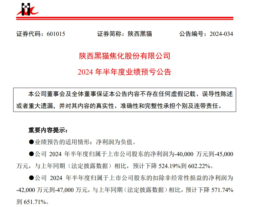 瑞财经 钟鸣辰 克日,陕西黑猫(601015)发布2024年半年度业绩预报,预计2024年半年度实现归属于母公司全部者的净利润为-4亿元到4.5亿元,同比降落524.19%到602.22%。公司实现扣除非经常性损益的净利润为-4.2亿元到-4.7亿元,同比降落571.74%到651.71%。 公告称,陈诉期内,公司主要产物贩卖代价同比降落,整体毛利率下滑,主业务务出现亏损。 陕西黑猫2023年年报表现,2023期内公司实现业务收入185.93亿元,同比降落19.86%,归母净利润-5.12亿元,同比降落281.7%。 资料表现,陕西黑猫属于焦化行业,主业务务为焦化产物、煤化工产物和煤炭产物的生产和贩卖,产物包罗焦炭、甲醇、合成氨、LNG、BDO和精煤等。此中,焦炭业务收入占总收入七成,为公司最主要的产物。 |