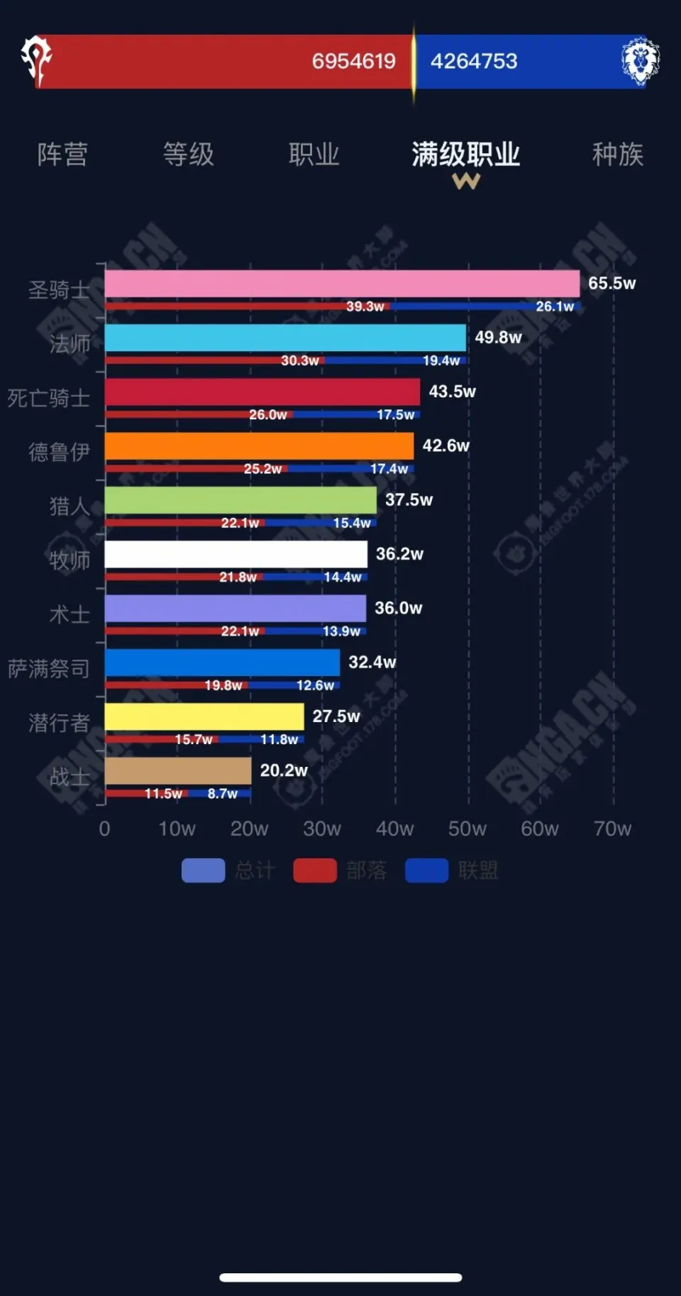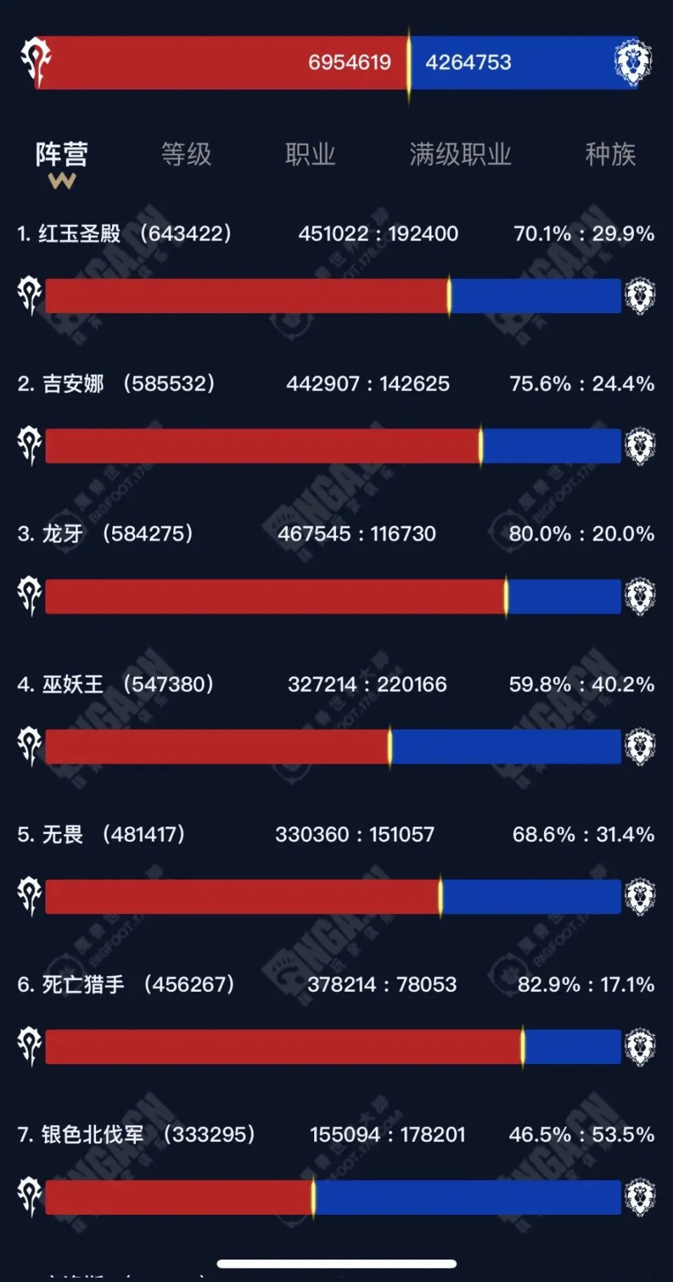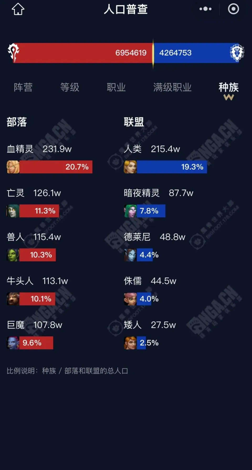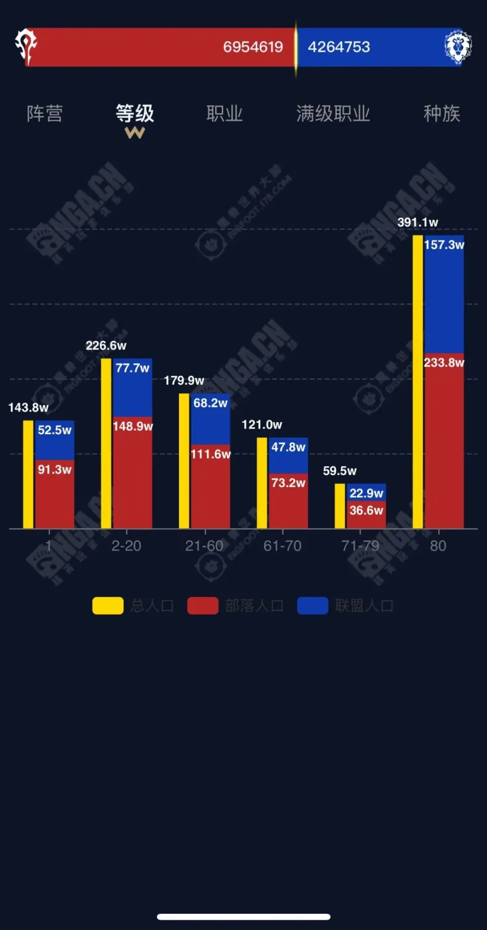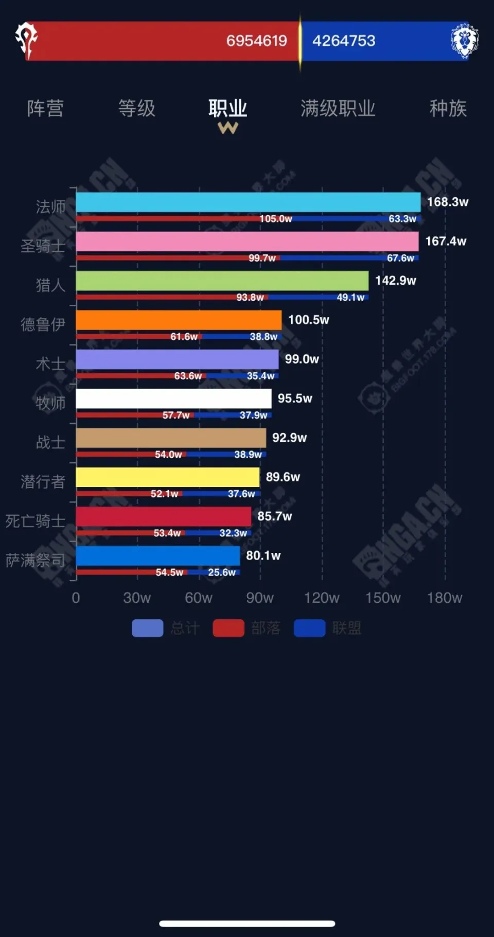 来看看大脚插件提供的魔兽天下国服总生齿的全方位统计吧。 此中有一些数据非常有趣,比方国服wlk仍然是满级脚色比力多,证明大部门玩家还是有耐烦练满级,在职业上,全部职业里法师最多,但是满级后是圣骑最多,满级的圣骑比兵士的三倍还多! (总生齿各服务器阵营比) 想找一个魔兽玩家聚集地,欢迎扫码入群! |