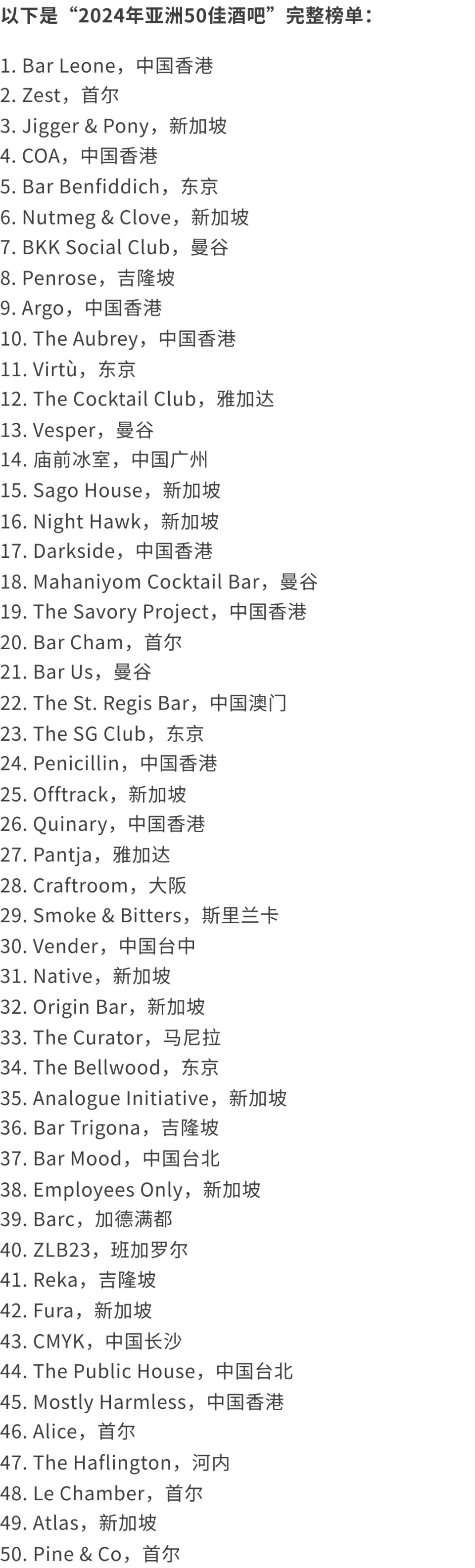 界面消息记者 | 张瑶 界面消息编辑 | 严之俊 7月16日,“2024年亚洲50佳酒吧”榜单于香港瑰丽旅店发表。本年的榜单涵盖18座差别都会,此中12家酒吧为全新入选。 来自香港的Bar Leone初次上榜,并击败连续三年位于榜单首位的Coa,被评为“亚洲最佳酒吧”。紧随其后的是来自首尔的Zest和新加坡的Jigger & Pony。 排名第一位的Bar Leone 本年榜单中出现了不少全新面貌,除了榜单第一位的Bar Leone外,另有第16位的 Night Hawk 和排名第19的The Savory Project等等。 The Savory Project 中国以15家上榜酒吧成为最大赢家,此中大陆地域有两家上榜,一家为广州的庙前冰室,本年排名升至第14位;另一家来自长沙的 CMYK,初次上榜位列第43位。 庙前冰室 CMYK 别的,新加坡有11家酒吧入选,数目与客岁持平;韩国和日天职别有5家酒吧入选。 Jigger & Pony 本年度亚洲50佳酒吧由265名成员构成的学术委员会策划,此中包罗行业领袖、作家、教诲家、记者、调酒师和酒吧业主。 图片来自:官方网站 |