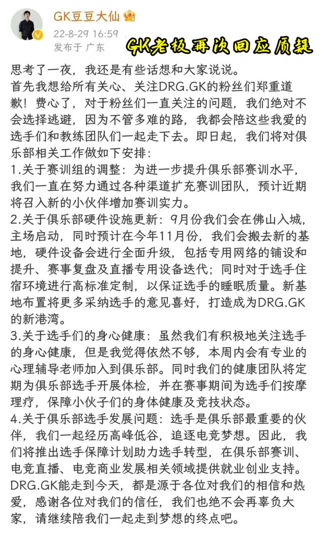 媒介KPL夏季赛季后赛已经进入尾声,佛山GK在败者组半决赛输给了北京WB之后再次止步四强,仍旧没能踏进总决赛的舞台。信赖很多GK的粉丝以及路人观众都对他们非常痛惜,毕竟近几个赛季GK的团体结果非常精彩,却总是跟冠军差着一点间隔。他们被镌汰后的记录片也是感人至深,这也引来了不少观众对GK粉丝遭遇的怜悯。日前GK老板再次回应粉丝质疑,答应提拔赛训,更新硬件办法。 GK老板再次回应粉丝质疑看过GK的记录片之后,不少路人粉丝都对他们的老板非常不满,更不消说他们俱乐部本身的粉丝了。各人对老板的质疑无外乎以下几个方面——赛训组不完备、硬件办法差、选手的康健标题以及尽力保障。本来GK的老板木木发长文说了一大堆话,但是他通篇都没有正面回应,这也引发了粉丝的剧烈不满,很多人都以为他是在破罐子破摔摆烂,而颠末了一夜的思量之后,豆豆再次发文回应了各人的质疑。 答应提拔赛训豆豆起首阐明白队伍赛训组的调解,称他们不绝在积极扩充团队,预计近期将招入新的小同伴提拔赛训气力。且不说豆豆的答应是真是假,把赛训放到第一位绝对是最准确的选择,哪怕当年的TS穷到发不起锻练和选手的工资,他们也是组建了一套不错的赛训组。GK被镌汰后择锻练的泪水也感动了不少人,他一个人要完成别人一个团队的工作,确实有些能人所难了。 更新硬件办法现在同盟中16支拥有着KPL正式席位的俱乐部都有了本身的主场都会,而且很多战队都有了本身的线下主场。GK的主场都会便是佛山,但是他们的线下主场不绝都没有启用。豆豆在声明中指出9月份他们将会启动佛山主场,而且11分会搬进新的基地,届时他们的硬件装备会举行全面升级,包罗复盘和直播的专用装备迭代、专用网络铺设以及选手的过夜环境提拔等。 小雨见解别的豆豆还称他们后续会引进专业的生理辅导老师以及康健团队,而且会为选手们退出保障筹划,助力他们转型。如果豆豆真能把本身的说的话全部实现,那么GK的选手们远景还是不错的,粉丝们就一起等着看豆豆老板的话能否实现吧。 |