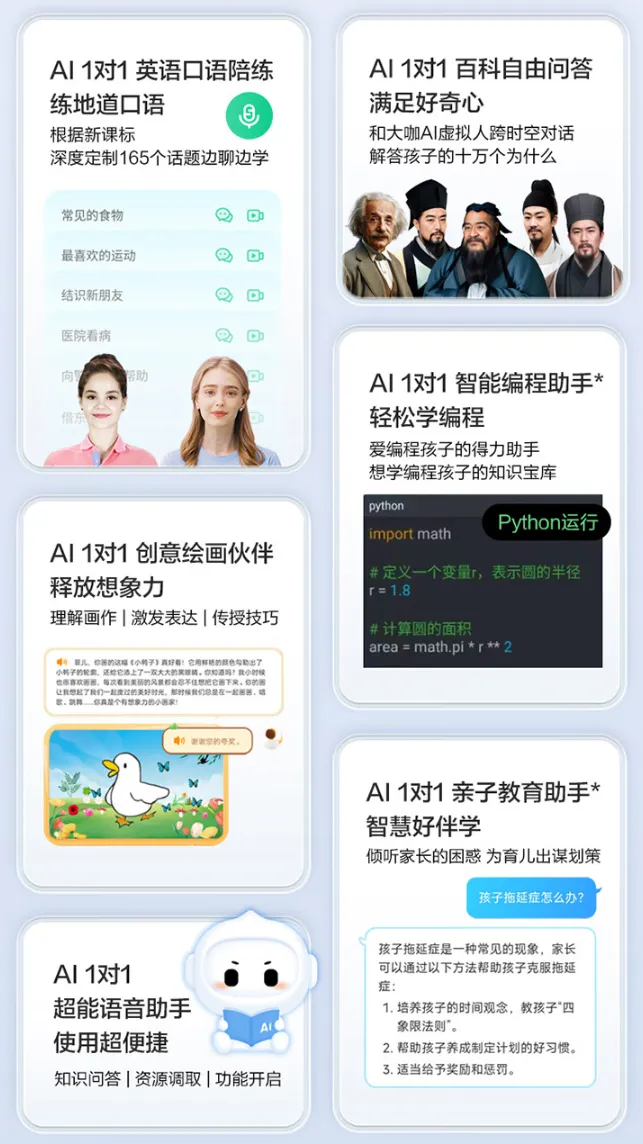 IT之家 7 月 21 日消息,科大讯飞 AI 学习机新品 T30 Ultra,其内置星火大模子,屏幕尺寸为 14.7 英寸现已开售,12GB+1TB 版本首发11699 元。 IT之家汇总科大讯飞 AI 学习机 T30 UItra亮点信息如下: 该学习机内置星火大模子,主打“AI 一对一”,支持 AI 答疑辅导、AI 提优课、幼小初高全科提升等功能;内置类自然光 + 微纳米类纸护眼屏,具备 3K 分辨率、120Hz 刷新率,PPI 为 247,支持硬件级低蓝光。 科大讯飞 AI 学习机 T30 UItra搭载行业首款星闪 AI 手写笔,支持超万级压感、磁吸无线充电,官方称拥有铅笔般的握感和誊写体验。 该学习机还配备双 1600 万像素主动翻转双目摄像头,以及 800 万像素前置摄像头、200 万像素坐姿摄像头。 T30 UItra还支持 AI一对一中英作文修正(包罗根本修正、深度修正、全文分析、写作发起等流程),还可围绕当前的作文写作要求针对性修正;支持 AI 一对一英语口语陪练、百科自由问答、智能编程助手、亲子教导助手等功能。 科大讯飞 AI 学习机 T30 UItra内置自研 AI 提优课程,还可在关键环节由 AI 提问来引导用户思考,支持诊断用户学习程度,实现“诊-学-练-测”四个流程。 别的,该学习机内置牛津大学出版社授权绘本,涵盖 6 大系列 15 级别 188 本英语原版绘本,可覆盖幼小阶段学习。 科大讯飞 AI 学习机 T30 UItra 参数信息如下: |