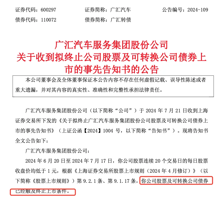 7月21日晚间,又有两家A股公司收到了生意业务所翰札,即将挥别A股市场。 01 广汇汽车 广汇汽车(600297)于当日收到上交所下发的《关于拟制止广汇汽车服务团体股份公司股票及可转换公司债券上市的事先告知书》。 该告知书显示,2024年6月20日至2024年7月17日,广汇汽车股票一连20个生意业务日的逐日股票收盘价均低于1元,根据上交所相干规则,该公司股票及可转换公司债券已经触及制止上市条件。 上交所将根据相干规定,对广汇汽车股票及可转换公司债券作出制止上市的决定。 当晚的另一则公告显示,7月21日,广汇汽车还收到了上交所下发的监管工作函。 该监管工作函提到,上交所已向广汇汽车发出拟制止上市的事先告知书,后者应实时披露,并充分提示风险,做好股票及可转换公司债券制止上市的有关工作。 别的,广汇汽车应尽快聘请主办券商,做好公司股票及可转换公司债券进入天下中小企业股份转让体系的具体安排和信息披露工作,确保公司股票及可转换公司债券在摘牌之日起45个生意业务日内可以挂牌转让,保护投资者股份转让权利和债券持有人的债券转让权利。 记者留意到,此前,在股价一连多日跌破1元后,广汇汽车自救动作反复,相干办法也曾动员公司股价上行,但终极并未突破1元关口,制止退市的办法终极也功亏一篑。 比方,在7月11日,广汇汽车控股股东广汇团体拟将持有的公司24.5%股份,即20.3亿股转让给金正科技,标的股份的总对价双方协商确定。 本月中旬,广汇汽车又与中钧科技签署战略相助协议。 别的,根据广汇汽车披露的业绩预报:公司预计2024年半年度净利润为-6.99亿元到-5.83亿元,预计2024年半年度扣非净利润为-8.72亿元到-7.56亿元。 广汇汽车将本期业绩预亏的缘故原由归为三个方面: 一是受市场消费降级,行业竞争格局加剧,各大车企为劫掠市场份额大打价格战,使得公司新车贩卖规模和毛利率较客岁同期均有所下滑; 二是公司在不停争取更多上风品牌授权的同时,对表现不佳的弱势品牌、一连亏损和低效门店接纳果断的“关停并转”步伐,造成陈诉期内应收债权、特许经营权等相干资产计提减值及加快摊销,产生一次性的丧失和费用; 三是陈诉期内公司资产减值较客岁同期有所增加,重要系存货跌价预备,以及公司恒久股权投资企业上海爱卡投资中心(有限合资)存在减值迹象,产生相应减值丧失。 记者留意到,港股公司广汇宝信(01293)也于7月21日晚间发布了广汇汽车收到拟制止上市告知书的环境。 如今,广汇汽车持有广汇宝信68.56%的已发行股本。广汇宝信董事认为,上述事项对公司营运及财政状态并无庞大不利影响,而公司将可以大概继承独立于广汇汽车营运。不外,广汇宝信仍旧提示公司股东及埋伏投资者在买卖公司证券时务须审慎行事。 02 *ST天成 另一家收到上交所拟制止上市事先告知书及监管工作函的公司是*ST天成(600112),翰札内容与上述广汇汽车收到的翰札内容雷同。 *ST天成传统主营业务是电气装备的研发、制造,产物重要功能是对电力体系的控制和保护,公司预计2024年半年度实现归属于母公司全部者的净利润为-6800万元到-1亿元,同比增亏。 别的,公司股票2024年7月19日收盘价为0.73元/股,自2024年6月24日至7月19日已一连20个生意业务日收盘价低于1元。 记者留意到,除了上述两家A股公司以外,7月21日晚,还有两家公司披露了与制止上市相干的进展或风险提示。 其中,越博退(300742)已被深交所决定制止上市,公司股票于2024年7月1日进入退市整理期,在退市整理期生意业务十五个生意业务日,末了生意业务日为2024年7月19日,并将在2024年7月22日被摘牌。 *ST华铁(000976)公告显示,该公司面临多重制止上市风险:一方面,公司2023年年报至今“难产”;另一方面,公司股票收盘价已一连十六个生意业务日低于1元;别的,公司还存在资金被占用情况。 |