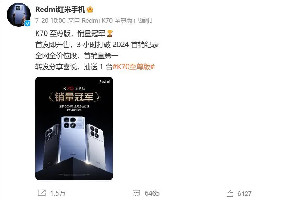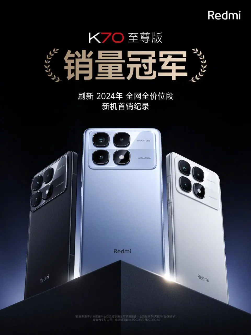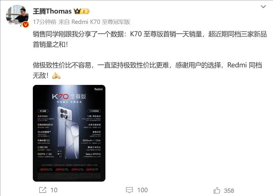 本日,Redmi品牌总经理王腾发布微博,称根据贩卖分享的数据,K70至尊版首销一天的销量,逾越了近期同档三家新品首销量之和。 别的,王腾体现,做极致性价比不容易,不停对峙极致性价比更难,感谢用户的选择,Redmi同档无敌。 在早些时间,Redmi官方曾公布,K70至尊版开售三小时,就突破了2024年首销记载,成为全网全价位段的首销量第一。 K70至尊版的销量成绩,无疑与产物的设置与代价有关。 该机搭载天玑9300+芯片和D1独显,同时配备LPDDR5X内存和UFS 4.0闪存。 别的,它采取1.5K直屏,前置2000万,后置5000万三摄,电池是5500mAh,支持120W闪充。 而在代价方面,K70至尊版起售价仅2599元。 |