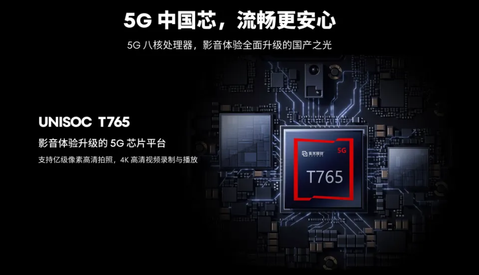 搭载紫光展锐 T765 国产 5G 处置处罚器,算是入门级别。