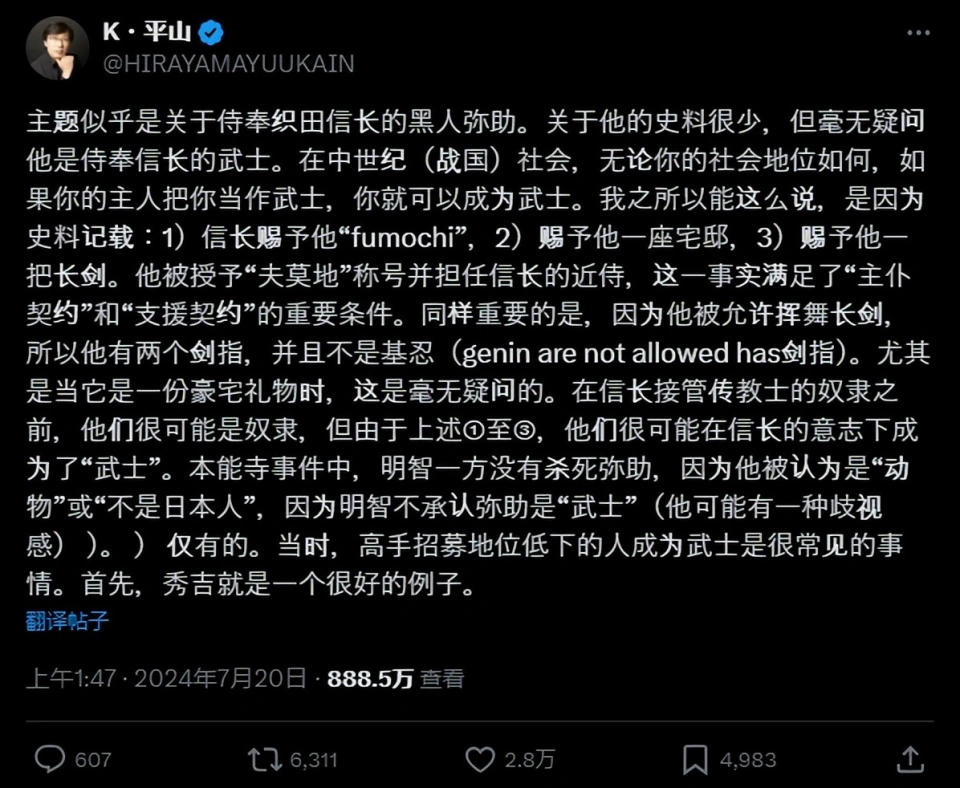 文/一碗葫芦 自从育碧的新作《刺客信条:影》公布之后,网上对的争议就不停没有断过。而这个争议的重心,就出在游戏的此中一位主角——黑人武士“弥助”身上。 作为一款少有的以亚洲为配景的《刺客信条》系列作品,这次的新作不光没有以亚洲男性作为主角,反而还从日本汗青的犄角旮旯里,翻出了一位名不见经传的黑人作为主角,这种“刻意”的活动引起了不少玩家的吐槽。 而更加离谱的是,育碧此前还体现,游戏里的两位主角将会“有着更加先辈的浪漫关系”,意味着,这两位主角在游戏中照旧LGBTQ人士——不得不说,这zzzq的味儿可着实是太冲了。 固然,骂归骂,只管这些事儿引起了许多玩家的不满,但舆论似乎并没有真正影响到游戏,《刺客信条:影》仍旧在紧锣密鼓的制作当中。 就像迩来游戏的叙事总监在担当IGN日本的采访时,还信心满满的体现弥助是《刺客信条》第一个以汗青真实人物为原型的脚色,而制作团队也盼望可以或许通过向汗青学家和研究职员相识更多内容,“用报告的故事去弥补汗青的空缺”。 然而,迩来发生的一件争议,却让《刺客信条:影》整个游戏都有些站不住脚了——由于大伙发现: 这个黑人弥助的“武士”汗青,似乎重新到尾都是被杜撰出来的。 固然这里照旧要说一句,固然关于“弥助”的纪录不多,但根据汗青文献和作品来看,日本从前简直是有“弥助”这么一号人的存在的。 在《日本教会史》的纪录中,弥助出生于葡属东非,而且被一位传教士以跟班的身份带到了日本。1581年,弥助和织田信长第一次晤面。由于信长从没见过黑人,以是自然对这位“通体黝黑”的跟班很感爱好,于是将其从传教士手中购入。 《南蛮屏风》中的黑人侍从 只不外,史料中从来没有提到过这位弥助曾经是一名“武士”。 在弥助成为新厂的侍从仅1年后,织田信长就因本能寺之变被迫自尽。随后由于某些缘故原由,明智光秀并没有正法弥助,而是将其发放到南蛮寺安置。这之后,弥助也就着落不明白。 从史料纪录的内容来看,弥助与织田信长打仗的时间仅仅1年,这段时间显然是不敷以让他担当严酷的武术练习的。同时,史料中也没有体现过弥助被授予类似“武士”身份的记录。 以是,弥助的真实身份很大概始终是一位仆人,只不外由于长相和本地人相差甚远,才在汗青上留下了一些陈迹。 然而近些年来,关于弥助的身份是“武士”的认知,似乎已经成为了公认的事变。 比方美国有线电视新闻网、BBC和 《期间周刊》等官方媒体,曾纷纷报道过这位黑人武士的来源; 以及各种游戏和影视作品中,也都常常可以或许看到弥助的身影。 不外相比于早期的作品中,弥助通常被描绘为跟班的形象,近几年来,弥助则广泛以武士的身份出如今观众和玩家眼前。 刺客信条新作的黑人武士,着实是外国人"捏造"出来的?既然弥助在汗青根本就没有多少纪录,那为什么到了几百年后,他却能以 “黑人武士”的形象受到云云大的关注呢? 随着《刺客信条:影》的争议越闹越大,大家逐渐将眼光放到了一位叫做“托马斯·洛克利”的教授身上。 虽说这位是一位英国人,但洛克利还在日本大学担任副教授的职位,而且热爱研讨日本汗青——尤其是关于弥助的那段汗青。 从研究履历和结果来看,洛克利曾发表过不少关于弥助的论文,还分别在2017年和2019年发行了《信长与弥助:本能寺幸存的黑武士》和《非洲武士:日本封建期间传奇黑武士弥助的真实故事》两本书籍,以致连大英博物馆百科全书中,关于弥助的部分都是由他编辑的,可以说公信力非常之高。 不外大家在进一步探究的时候,照旧逐渐发现了端倪。 有网友发现,在关于“弥助”的维基百科中,一位叫做“Tottoritom”的用户是这个词条的资深编辑。 随后大家还发现,这位用户的真是身份就竟然就是那位叫做洛克利的教授。 固然,研究弥助的学者编辑wiki,看起来也不是什么离谱的事儿。 但怪就怪在,他在2015年9月份编辑了一段信息,体现引用了本身2016年发布的一片论文。而在2017年2月的时候,他又将这些信息的引用来源改成了本身2017年发行的一本书籍。 2015年的wiki,怎么会“预知”到16年的论文以及17年的书籍呢? ——这下大家明确了,原来关于弥助的许多内容,都是洛克利本身捏造出来的。而这场“自编自导”的闹剧,竟然影响到了无数的作品和社会认知,直到迩来才被揭袒露来。 这件事变一经曝光,离谱的水平让不少网友都惊掉了下巴。随即大量的日本网友开始对这位教授举行了声讨,谴责这种改编汗青的举动。 如今,这位洛克利教授已经删除了本身的全部外交账号,而日本大学的官网也已经删除其简介。有听说说到洛克利已经被日本大学开除,不外是否真实如今还不得而知。 这次的闹剧,不由得让我想到了前两年国内也有类似的一件事儿,而且那件事变更加怪诞。 事变同样发生在维基百科上,怪诞的地方就在于,一位高中肄业的女生以一己之力编造了整个古罗斯国下面的公国——特维尔国的的汗青。 为了让这个汗青更加真实,她还设计了各种汗青人物和家属之间的故事,以致还创造了一个不存在的“卡申银矿”,捏造出特维尔国和罗斯国为了这个矿开展战争的故事。 由于古罗斯国的汗青着实冷门,再加上这位女生编造的故事还真“挺像那么回事儿”,以是这段“汗青”在很长一段时间里都没被发现端倪。固然,谎话终有
