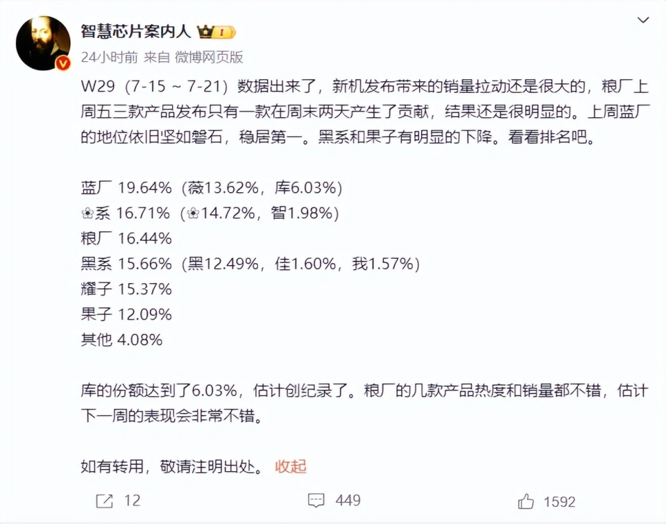近来,canalys、IDC、Counterpoint都给出了二季度国内手机的销量份额统计。由于国内具有华为这种顶级品牌,也是反映我们身边的情况,因此比环球销量更受关注。 那么,在手机大战的六个品牌中,谁是赢家,谁是输家呢。 我们不妨先看看各家数据,看看赢家输家。 先看看IDC的数据,其这张表给出的是份额,表现华为增幅达50%,攀升第二,苹果跌出前五,成为其他,OPPO和光彩只有小幅下跌,不能算是输家。这里的输家就是苹果。 再看看canalys的数据,这里前五名也没有苹果,华为涨幅41%,无愧最大赢家。小米和vivo涨幅靠近,属于冠亚军。 至于Counterpoint,则表现苹果排名第二,但跌幅不小,同时OPPO跌幅也不小,这是与其他数据有收支的地方。而其也表现华为涨幅最好,涨幅随后的是小米vivo。 固然各家排名有所不同,但涨跌幅都是同等的。以是我们可以得出结论,这次最大赢家肯定是华为,小米和vivo都有不错的体现,光彩体现排名第四,OPPO排名第五,苹果回落最大。 现实上,iPhone在今年618体现不错,单品、总贩卖额上都很突出,但这也分析4月、5月其销量确实不理想,仅靠618依然没有扭转颓势。 现实上,如今关于苹果的全部产品,都处于关注度不停下滑的状态,包罗手表、电脑、平板等等,其缺乏充足的创新,按部就班的筹划,以及远低于对手的性价比(比方64GB存储),让关注度不停低落。 而反观华为,在平板、手表、电脑上的创新不停涌现,并且代价适中,强化功能体验,因此固然也没有特别的爆款出现,但仍可以不停劳绩用户。 同时,这次数据另有折叠屏的信息。 IDC数据表现,现在华为占据41.7%的份额,相当于二三名vivo光彩的总和,而二三名在不停推出新品的情况下,市场份额也有增长的势头。 我们再看看2023年整年的份额图,就会发现华为的份额还增长了,而vivo则是异军突起,从第五名变为了第二名,发展迅速。 现实上,由于折叠屏手机机型较少,许多厂商大概一个季度都没有一款折叠屏新品,以是季度之间变革较大。但不管怎样,vivo的发展还是很显着的。 但现实上,折叠屏手机占总体份额较小。客岁折叠屏出货700万台,而手机总销量是2.89万台,折叠屏只有2%-3%的份额。今年折叠屏如果到达900万台,份额也不会有太大提拔,没有到发作增恒久。 那么还剩末了一个标题,下半年会怎么走? 从一些较快的周统计数据看,华为现在在前三已经站稳脚跟,这还是其没有紧张产品发力的情况下。可以预见的是,下半光阴为肯定会王者归来,得到自己应有的位置,这点毫无疑问。 而苹果方面,现在6.1英寸的新iPhone将很难有让消费者眼前一亮的本领,听说17代要出Slim大屏版,大概会是一次突破,但在16代上大概许多人还是会以为乏善可陈。 而对于国产手机市场来说,如今有四个热门必要互相竞技,分别是国产创新、拍照、游戏、AI。 在国产创新方面,华为一枝独秀,披荆棘,并且有纯血鸿蒙将登场。而其他品牌,也在相机模组、NPU芯片、充电管理、体系等方面增长国产创新。 在拍照方面,今年固然各家大幅提拔了镜头的豪华水平,但总体来说,拍照上与相机的差距越来越远,环球微单市场开始复苏,手机只能正视这种差距。 在游戏方面,专业的游戏手机声量越来越小,没有成为主流。由于突破不了运算和散热的标题,现在没有史诗级新游戏出现,游戏手机正被高性能手机代替。 而对于AI手机,当下各家宣传不少,但现在没有杀手级应用,各家都属于投入中。 可以看出,手机市场总体上热门不多,下半光阴为Mate 70系列,小米15系列,iPhone 16系列都是预定的热门。同时,下半光阴为折叠屏大概也会带来一波新的热门,估计会有更新的技术搭配其上。 上半年已经告一段落,那么,你更悦目哪家在下半年的发展呢? |