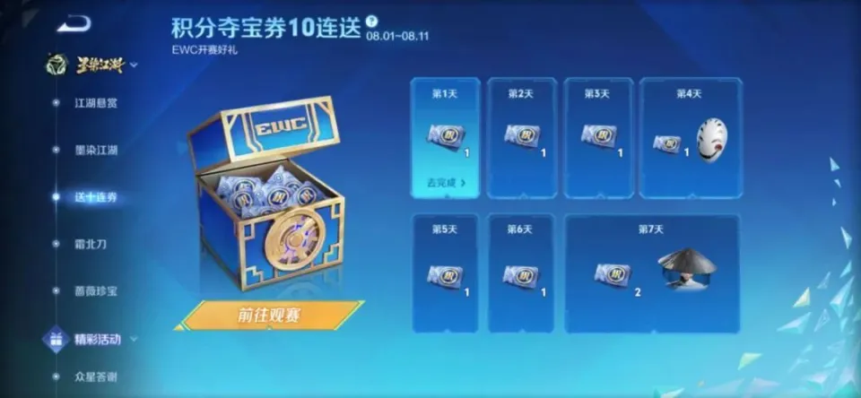 8月1日至8月11日,期间,玩家只必要进入活动列表,到场“积分夺宝券10连送”的活动,并完成观赛使命即可领取到嘉奖,紧张是观看沙特举行的电竞天下杯。