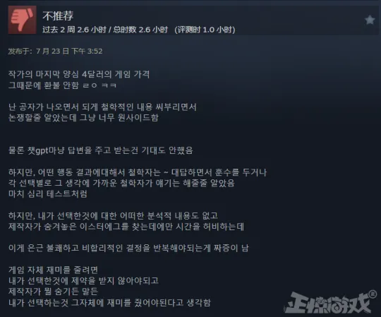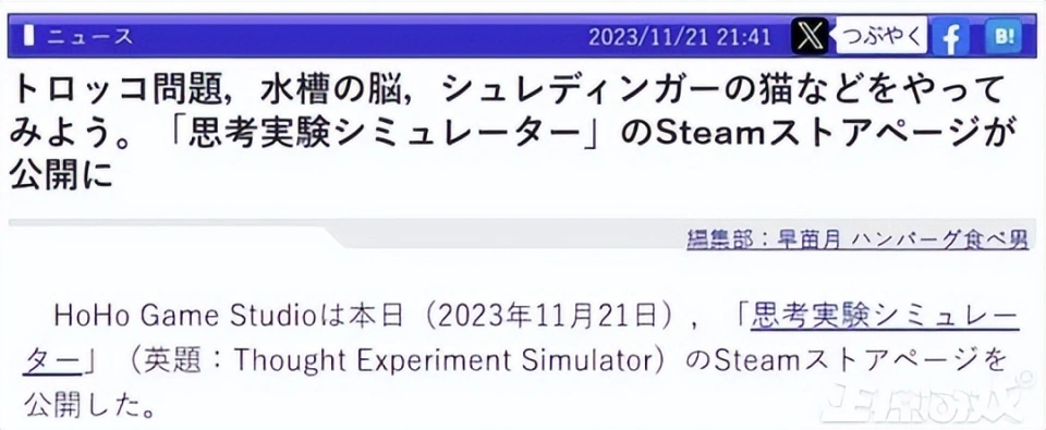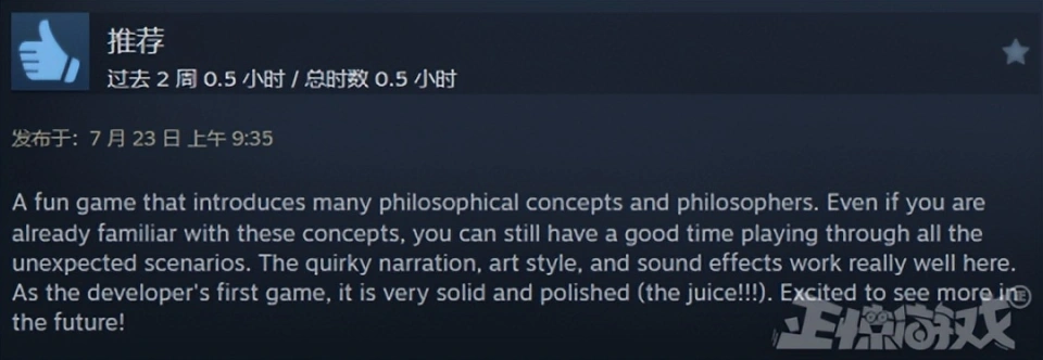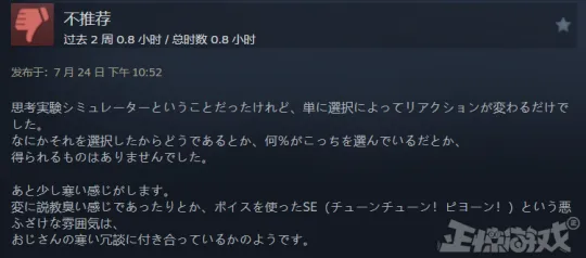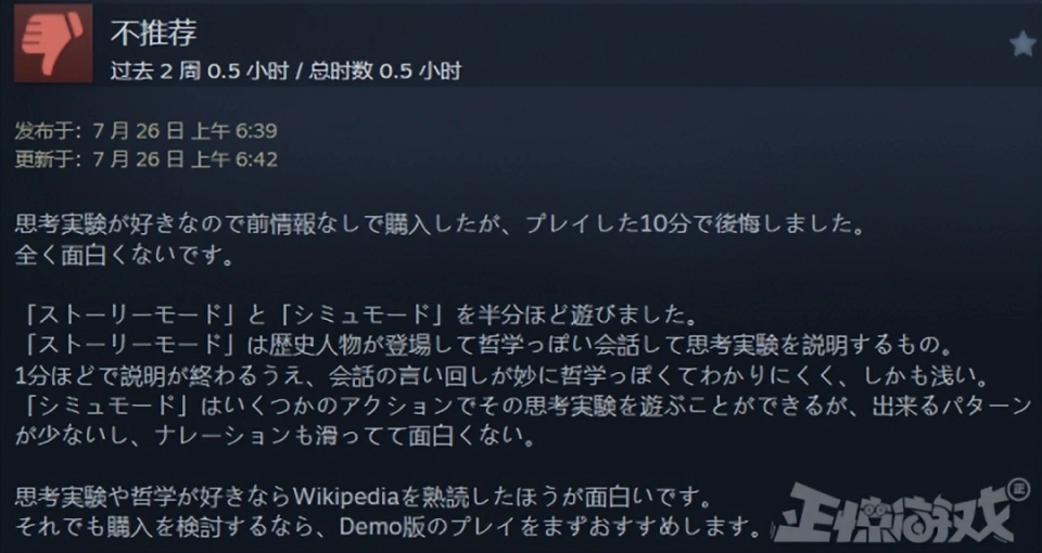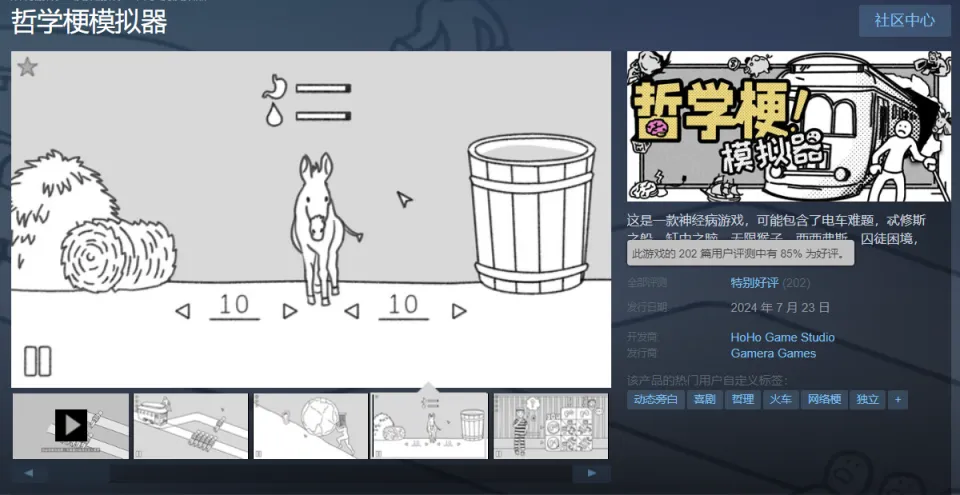 各人好,这里是正惊游戏,我是爱吃瓜的正惊小弟。 在面对即将无情碾过5个倒霉蛋的失控电车,手握利用杆的你究竟该是该选择改变轨道,让电车碾过另一条轨道上的1个人,照旧该让电车按照正常蹊径碾过5个人? 显而易见,无论你做出什么样的选择,这都是个值得深思的哲学问题。 但如果你可以做出让电车发生侧移,把5+1人都给闪电旋风劈掉的选择,那么这个“地狱笑话”就变成了一个故意思的哲学梗。 是的,只要你没有道德,就不会被哲学问题给道德绑架。 近日,就有一名自称是来自中国的24岁梗小鬼,在Steam商店上架了一款以地狱笑话,哦不,是哲学梗为主题的意见意义游戏《哲学梗模仿器》。 游戏自己玩法比力简朴,就是把布里丹之驴、电车困难、洞穴寓言、缸中之脑、公地悲剧、连锁悖论、忒修斯之船、无穷猴子、无知之幕、西西弗斯、传送悖论、囚徒窘境、薛定谔的猫、一棵树倒下、着名小提琴家这些超经典的哲学问题摘出来,在保留他们本来的风味同时,加上大量非常很“暗中”的地狱笑话,用来逗你一乐。 譬如说,如果西西弗斯是个可爱的双马尾萌妹子,你还忍心让她去把巨石推到山顶不? 当你辛辛苦苦搭好的忒修斯之船,被米老鼠开着邮轮给撞了,它的版权是该属于原作者,照旧迪士尼? 又或是如果囚徒窘境变成了炒股,你又可否忍住梭哈的快乐呢? 小弟团体玩下来的感受呢?借用网友的一句品评来说,就是这XX游戏给我整乐了。 当然,在一遍又一遍从严肃的哲学思考变成寻觅沙雕哲学梗的过程中,也不禁让人开始猜疑起了作者的精力状态,以及猜疑起自己为啥能“秒懂”的精力状态起来。 讲道理,这才是一个比力正常玩家的嬉戏状态不是? 究竟,你总不能指望一个标价19.8的游戏,真把这些哲学大道理给说透不是,图一乐就已往了。 但小弟观察到,这游戏对于一些爱较真的外国人网友却意义非凡,以致于让他们在品评区开起了“辩说大会”。 譬如说就有来自日本的网友看不懂梗,还吐槽道: —固然是哲学实验模仿器,但只是根据选择的差别,画面发生相对应的变革。就是选择了什么以是就发生了什么事,并没有表明哲学思辨,也都没统计有做出各项选择的百分比人数。 总之有点无聊,我感觉还有点冷,希奇的说教的感觉,恶作剧的配音也跟氛围不符,我好像在陪我叔叔冷笑话。 另一位来自日本的网友也以为这游戏相当“肤浅”: —因为喜欢思考实验,以是之前没有信息就买了,但是玩了10分钟就痛恨了,一点也不风趣。我玩了一半左右的“故事模式”和“模仿模式”,“故事模式”是汗青人物登场,用哲学般的对话说明思考实验的东西,大概1分钟左右就结束了说明,而且会话的表达方式很希奇,很像哲学,而且很肤浅。 “模仿模式”可以用几个动作玩谁人思考实验,但是能做的模式很少,旁白也滑得不风趣。 如果你喜欢思考实验和哲学,最好熟读维基百科。即便云云,如果要思量购买的话,起首推荐玩Demo版。 韩国网友这一次也稀有跟日本站在了同一边: —4美元的游戏代价让我以为本心,但全程都是制作人对哲学的个人化表达,没有对我做出的选项做出表明与分析,感觉在玩一个为了搞笑而搞笑的游戏。 相反的是,西欧地区的玩家则在真心享受这游戏,譬如说俄国老哥就以为超等好玩: —一个风趣的游戏,介绍了很多哲学概念和哲学家。纵然你已经熟悉了这些概念,你仍旧可以在全部意想不到的场景中玩得很开心。古怪的叙述、艺术风格和音效都很不错。作为开发者的第一款游戏,它非常精致风趣(干杯!!!),等待在将来看到更多! 西欧小伙也以为拥抱快乐就够了,日韩网友多少有点上纲上线: —这是一个用来打发几个小时时间的小游戏,不是全部的窘境都须要直接办理,有些只是一系列的爱好。你对游戏的印象大概取决于你是否幽默。 当然,之以是如许一款名不见经传的哲学梗国产小游戏会在海外市场取得不错的关注度,最重要的缘故因由是在游戏demo测试的时间,制作人落七在国外论坛Reddit上传了一则试玩视频,引起了超七千的点赞,成为论坛当红辣子鸡。 过后,日韩地区的主流游戏媒体,也将这个游戏捧上了当代年轻人“头脑实验”的神坛,惹来一众玩家的关注。 但流传这事吧,你也是懂的,事变的真实面貌很容易会在流传途中出现一定程度的毛病。这一传十,十传百,《哲学梗模仿器》就逐渐被传成了一位中国24岁天才哲学家,用来独特本领解构经典哲学问题的创意大作。 云云一来,就让很多玩家都对这作品抱有了不应有的等待。 但转过头来想想,过分神化的产物跟只想玩梗的内容的对比,又何尝不是一场群体性的“哲学狂欢”跟当代的头脑实验呢? 顺带一提,从制作人落七在个人社交媒体分享的研发心路跟采访回应来看,他作为一位刚从美国纽约大学结业的游戏专业门生,创作这款《哲学梗模仿器》的初志,只是寻常B站刷得多爱玩梗,想用“梗小鬼”的头脑去试着做人生中首款实验性子的游戏。 出于严谨思量,他还向普雷斯传授发送了一封申请「电车困难」图片利用允许的邮件,没成想被人家一眼相中,鼓励这位小伙大胆去做。后面,他在做完demo后,也是比力纠结要不要继续做完,效果没想到这游戏在Reddit论坛不测火了。 (版权申请邮件) 以是,做游戏这件事吧,还真没我们想得那么难:一个风趣的创意加一丢丢机会,在当下媒体的推波助澜下,你也能成为享誉环球的“