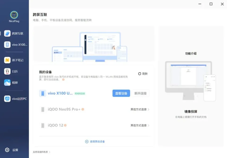 另一个我不得不提的点是,OriginOS 极佳的桌面端互通本领。在 PC 上下载安装「vivo 办公套件」后,你就可以体验得手机跟电脑之间无缝地互联互通。相比其他家的类似功能,vivo 做得好的是每次重新毗连办机电脑时极其方便和无感,而在相互传输数据、投屏操纵方面也有着稳固、流畅、符合直觉的体验。