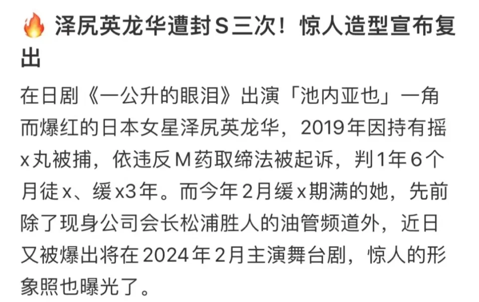 我那又疯又美的白月光前妻,终极还是复出了... 前段时间,舞台剧《欲望号街车》在日本大阪公演。 作为主演的泽尻英龙华上台谢幕,全场观众都在欢迎她的回归,欢呼声出人意料的大。 观众这状态,倒显得大人凭空比别人多了一段影象... 别看姐长着一张超绝小白花脸,但曾经干的每一件事都很令人震动。 作为演技+仙颜双黄蛋选手,17岁出道作《一公升的眼泪》不知道赚了多少人的眼泪。 《狼狈》中又具像化为腐烂衰败的俗艳玫瑰,在理想梦境与现实之中冲撞。 但越是老天爷追着喂饭吃,她就非得把碗摔个稀烂... 公开场合摆臭脸是最根本的,宿醉陌头口吐芬芳也只是日常使用。 之前她结婚时还订定了一个月同房不能高出5次,违规一次罚50万日元(约人民币3.8w)的奇葩婚前协议。 不但靠仙颜把老公制得服服帖帖的,观众也尤其偏幸她。 口碑翻车在媒体前哭一哭,各人就又控制不住哈特软软了。 不外大概也正是由于犯错本钱太低,才让泽尻英龙华一再有恃无恐,终极被捕。 不管国外什么态度,反正咱中国网友往那一站就是兵,齐备一个拒绝的大动作。 姐这铺天盖地的营销,属实是碰上铁板了。 话说回来,泽尻英龙华作成如许,一回头另有人等着她重新开始,谁说极致的仙颜不算是通行证呢。 虽说各人都鼓励寻求内涵美,但现实中谁能拒绝仙颜,自己天天照镜子心情都会自动愉悦三分... 而且这种美,最好是自然无雕饰,原生自然皮。 |