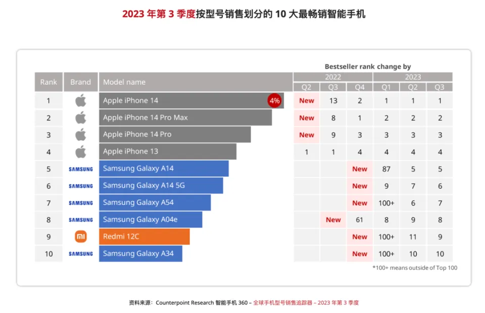 近来市场调研机构 Counterpoint 出了个榜单:2024 年第二季度环球市场卖得最好的 TOP10 机型