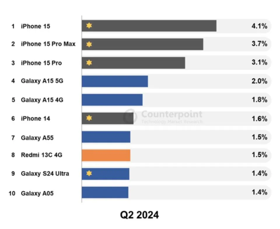 苹果和三星照旧牛哇。近来市场调研机构 Counterpoint 出了个榜单:2024 年第二季度环球市场卖得最好的 TOP10 机型。不意外,iPhone 15、15 Pro Max、15 Pro 三款机型占据前三。iPhone 14 也买的不错,排在第六名。三