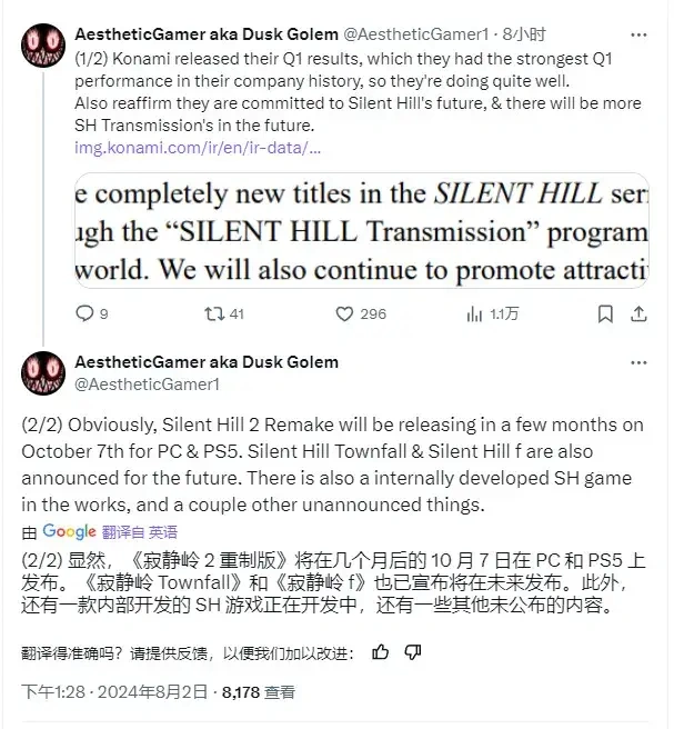 一、《实况气力棒球》连任冠军 在7月22日至7月28日的新一周Fami通销量榜上,《实况气力棒球2024-2025》以3.5万的销量连任两周冠军。 Switch版《海贼王:时光旅诗 豪华版》得到第二名,《马力欧赛车8:豪华版》再次突入前三名。 到底是谁还在买马车啊? 以下是具体排名: 1.【Switch】《实况气力棒球2024-2025》–35,280 (202,227) 2.【Switch】《海贼王 时光旅诗 – 豪华版》–16,373 3.【Switch】《马里奥赛车8豪华版》–10,073 (5,921,498) 4.【Switch】《任天国天下锦标赛NES版》–8,743 (35,134) 5.【Switch】《路易吉洋馆2 HD》–8,339 (158,930) 6.【PS4】《实况气力棒球2024-2025》–8,209 (57,419) 7.【Switch】《集合啦!动物森友会》–7,567 (7,850,176) 8.【Switch】《我的天下》 –6,595 (3,578,258) 9.【Switch】《好汉传说 黎之轨迹II》–6,486 10.【Switch】《超级马里奥兄弟:惊奇》–5,794 (1,897,108) 二、任天国新财报出炉,业绩遭腰斩 迟迟不推出新平台的任天国,本季度遭遇反噬。 克日,任天国发布2024年1季度财报(4~6月)。该季度业务额2466亿日元同比镌汰46.5%,遭遇腰斩。 业务利润545亿日元同比更镌汰70.6%,几乎斩到了膝盖。 此中重要缘故因由是Switch疲态尽显,销量下滑严峻。主力机种OLED版销量下跌凌驾56%,软件也跌了41%以上。 任天国守旧头脑严峻,Switch吃了8年老本还迟迟不推出新平台。 今年没有大作支持后,主机对玩家的吸引力大幅降落,反应在销量上,就是腰斩。 今年任天国已公布的游戏根本都是小体量,不敷以扛起大旗,只有等来岁的《银河兵士:Prime4》来终极拉升一下年度销量了。 任天国畏惧失败可以理解。但迟迟不推出新平台,不但新游戏无法登岸,也辜负玩家的等待,导致转向其他平台。 尽管如许,任天国仍旧公布不调解操持,维持1350万台的Switch年度贩卖目的。 三、着名游戏杂志停刊 受游戏业裁人和倒闭风潮影响,已经运营了33年的游戏杂志《Game Informer》,忽然公布关闭。 该杂志是Game Stop旗下刊物,于1991年创刊,2000年被GS收购,一直是货架上的常客,陪同了很多玩家的成长。 8月3日官方发布公告,向读者公布《Game Informer》的消息。 该社主编也发布了布满遗憾的告别: 这实在也是媒体数字化的缘故因由,相比之下纸媒代价高昂,时效性差。新一代读者已经适应了更加便捷的互联网信息,纸媒注定会徐徐灭亡。 四、《纸片马力欧:折纸国王》、《马力欧高尔夫》国行过审 国家消息出书署公布《2024年入口网络游戏审批信息》公告,8月份通过了15款入口游戏版号。 包罗《漫威争锋》、《高殿战记》、《彩虹六号》等着名游戏。 Switch平台则过审了《纸片马力欧:折纸国王》、《马力欧高尔夫》两款游戏,将择日登岸国服市肆。 五、《宝可梦不可思议迷宫 赤之救济队》登录NSO 任天国公布,GBA经典游戏《宝可梦不可思议迷宫 赤之救济队》,将于8月9日参加任天国NSO高级会员游戏库。 该作由Chun soft开发,于2005年登岸GBA平台。 这是一款不思议迷宫玩法的游戏,玩家要饰演变成宝可梦的人类,前往随机迷宫完成使命。同时学习新的招式,招募伙伴,终极解开变身宝可梦之谜。 六、多款新游戏公布登录Switch 克日多款新游戏公布登岸Switch,我们来简朴汇总一下: 永井豪经典原作改编游戏《UFO魔神古兰戴萨:纵使搭上性命》将于11月14日登岸Switch平台; 矿类沙盒冒险游戏《核心保卫者》PS4、Xbox One和Switch版将延期至9月17日发售; 动作冒险游戏《Selfloss》将于9月12日发售,它采用斜45°视角,主角要在古俄罗斯和冰岛神话中冒险,用法棍打倒神灵; 《恶霸鲁尼》将于 8 月 20 日被添加至公司推出的订阅服务 GTA+ 的会员免费游戏库,传GTA+会引入Switch平台; 角川人气动漫《贤惠幼妻仙狐小姐》的改编游戏将于今年夏日推出,登岸Switch和手机平台; 乙女游戏《塞莱斯蒂亚:运气之链》公布最新预告,将于9月12日发售,登岸Switch和PC平台。 SE官方公布了《浪漫沙加2重制版》(七好汉的复仇)新截图,展示了游戏脚色战斗画面等,并透露了游戏战斗情报。本作将于10月24日登岸PS、NS和XBOX平台 七、《好汉传说:界之轨迹》公开预告片 Falcom克日公开《好汉传说:界之轨迹》预告片。 《好汉传说:界之轨迹》是轨迹系列20周年怀念作,延续了轨迹系列的导力科技天下观,舞台依据故事先容转移到了塞姆利亚大陆的奥雷德自治州,是接续好汉传说系列第九代《好汉传说:黎之轨迹》的后续故事。 该作将于2024年9月26日发售,登岸PS5、PS4,中文版同步。 Switch版暂时未定。 八、曝科乐美欲内部开发全新《沉寂岭》 据母舅党Dusk Golem爆料,Konami有意让内部工作室开发新的《沉寂岭》游戏。 之前公开的《沉寂岭:短讯》、《沉寂岭2:重制版》、《沉寂岭:飞升》等均外包给其他开发商。 大概是由于Q1财报非常亮眼,到达公司汗青最高程度。高层心情大好,重申将会致力《沉寂岭》这个IP,并开发更多新作。 说实话科乐美近几年专注弹子机和房产中介,照旧赚了不少钱的。但多年未专注游戏业,工作室七零八落,还能不能撑起一部新作,尚未可知。 九、《文明VII》将于8月20日公布大量信息 2K和Firaxis Games克日高兴地公布,将于20日的科隆游戏睁开幕夜公开大量信息,并睁开一系列活动。 此中包罗: 平静洋时间8月20日上午11:00:《文明VII》公开实机游戏画面。 ● 平静洋时间8月20日下战书1:30:直播《文明VII》官方游戏演示,内容包罗凌驾20分钟的独家见解,并先容游戏的创新