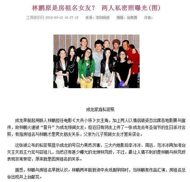 大概从这一刻开始,成龙才真正发现最体贴自己的女人正是妻子,也因此开始逐渐器重起儿子房祖名了。 那之后他的生存一下子有了改观,年仅17岁便拥有了父亲给的豪宅、豪车,每个月零费钱高达6位数。 其时房祖名也琢磨着谈恋爱,却被父亲制止了,对方认为他应该将精力放在奇迹的打拼上。 于是2001年,19岁的房祖名在成龙的资助下,师从“音乐教父”李宗盛,为入行做预备。 两年后,又是在成龙及其好友杨受成的资助下,他开始拍电影。 首部作品便是《千机变2》中的男主角,搭档的是奇迹处于当红状态的Twins,甄子丹、吴彦祖、梁家辉等都来恭维。 尽管这部作品日后被喷得体无完肤,但没人可否认:房祖名出道即顶峰,乃至还因为这部戏得到了金像奖最佳新演员的提名。 不但如此,因为该片他还与阿娇传出绯闻,那之后两人常常相约外出照相。 而与阿娇传暧昧的同时,房祖名又接连和音乐上有过合作的戴佩妮、梁静茹擦出火花。 别的,刚出道两年的、被许冠杰视为“乐坛后起之秀”的官恩娜,也卷入这场N角恋中。 两人不但常以SMS传情,还结伴去欣赏周杰伦的演唱会。 但大概是母亲林凤娇在这个阶段下了一道“不许和圈内人恋爱”的下令,房祖名和以上女星的暧昧便都烟消云散了。 同年,他的奇迹连续高光,发行了自己的同名专辑。 而到了2005年,年仅23岁的房祖名登上了央视春晚,演唱了自己创作的单曲《要强》。 也是这一年,他又迎来了一位被外界视为“最靠谱的绯闻女友”:薛凯琪。 两人因合作电影《早熟》结缘,女方同样家世不俗,舅父曾是华星高层,在其资助下,她出道便签约了华纳唱片。 与房祖名拍戏后,男方对她情根深种开始剧烈寻求,直至该片上映时,两人的关系便被狗仔曝光了。 吴君如还曾在节目中透露,自己问过成龙对薛凯琪的看法,他复兴“不错”,也令外界沸腾。 只是后来这段关系又卷入了女方的蓝颜知己方大同,只得不了了之。 3.劣迹斑斑而房祖名的“艳遇”,并未竣事。 那之后,他又先后与萧亚轩、谢霆锋的妹妹谢婷婷、邓丽欣、林鹏等传出绯闻,可以说从未有过空窗期。 而这期间,长得不帅、也没什么特别才能的房祖名,演艺奇迹却始终飞黄腾达。 他接连主演了《男儿本色》《花木兰》,乃至还进入姜文的剧组拍摄《太阳照常升起》…… 除了电影资源,他的演唱奇迹虽没有太大希望,却并不妨碍其进入奥运歌曲《北京欢迎你》的演唱行列。 几年后,在其父成龙主演的第100部电影《辛亥革命》中,房祖名也高调加盟。 但此片却成为了一个“笑话”——此片被评为成龙迄今最差的一部作品,票房仅为12万美元,且在烂番茄网站上得到了8%的评分。 不外这并不妨碍房祖名的热度直线上升,因为他被人提起时,始终都有一个保底的身份: 成龙的儿子。 而且因为绯闻一段接一段,其璀璨的情史也成为话题直线上升的因素之一,外界乃至如许评价他:流水的女友,铁打的“龙太子”。 2010年年底,房祖名身边的女伴换成了“车模”李颖芝,但她并未停顿多久,就被有着“小徐若瑄”之称的李毓芬截了胡。 这之后,他的审美肉眼可看法酿成了“爱上嫩模”: 随即又接连和林盈臻、苏子贤等大传暧昧,也因此成了著名的“集邮男星”。 尽管口碑、实力都不太出挑,但房祖名还是在2013年得到了和韩寒合作的时机。 他主演的《一座城池》于同年9月上映,搭档的是刚因唱红了《小苹果》而成为热门男星的肖央,但这部电影却扑得无声无息。 没关系,因为随后房祖名又和郭采洁主演了《不测的恋爱韶光》,饰演的还是自己比力认识的呆萌宅男的脚色。 这是他出道的第十年,固然称不上星途璀璨,却机极有在感。 假如没有次年的吸du变乱,相信房祖名的奇迹会连续“璀璨”下去。 2014年9月,他与好友柯震东因在自己代价万万的豪宅中聚众被抓,且随即便被曝出之前有8年吸du史,震惊外界。 而其父成龙这时,已经做了5年反du品大使。 对此,他痛心疾首地公开表现: