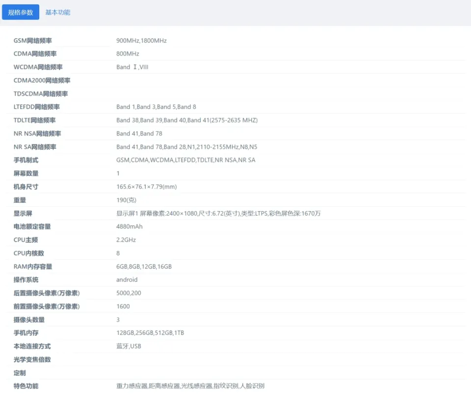 电信装备终端网显示,这款新机的机身尺寸为165.6×76.1×7.79mm,机身重190克;正面配备了一块6.72英寸屏幕,分辨率为2400×1080;搭载了CPU主频为2.2GHz的8核处置惩罚器,提供6GB/8GB/12GB/16GB内存以及128GB/256GB/512GB/1TB机身存储;前置1600万像素摄像头,后置5000万像素主摄和200万像素镜头组合;内置额定容量4880mAh电池。