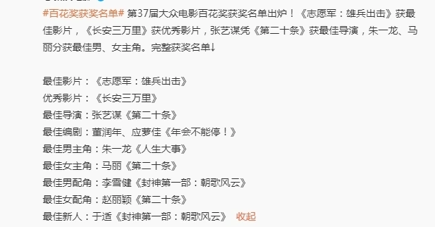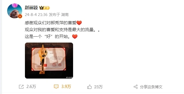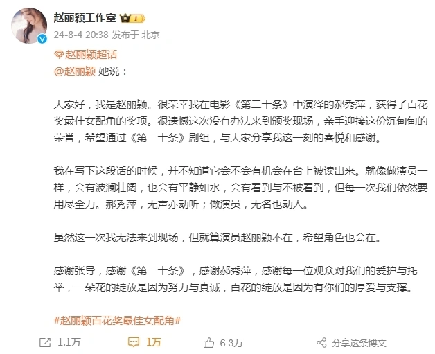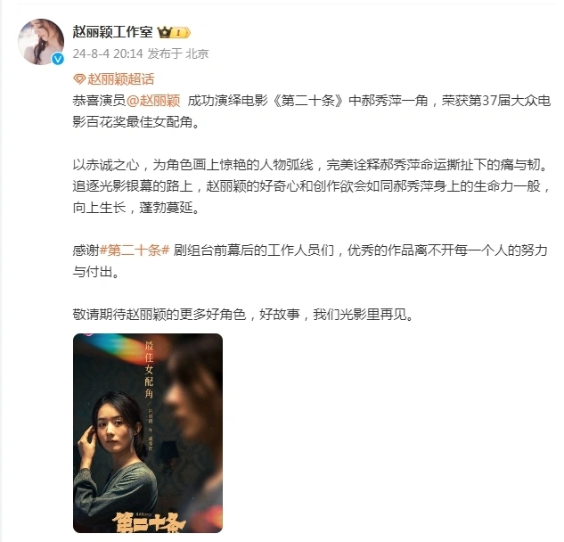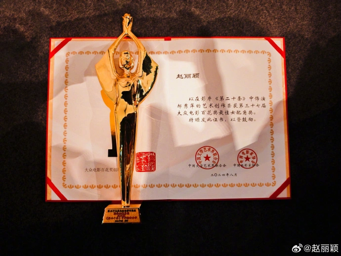 8月4日晚,第37届大众电影百花奖颁奖仪式终于落下帷幕,朱一龙依附在电影《人生大事》中的精彩体现一举摘得最佳男主角,而他此前也凭此脚色荣获了金鸡奖,简直太厉害了。而最佳女主角则由马丽摘得,马丽依附电影《第二十条》得到此殊荣。提及来,这次百花奖,电影《第二十条》是最大赢家,由于该片不止收获了最佳女主角,还一并摘得了最佳导演以及最佳女副角。张艺谋导演依附此片得到了最佳导演,而演员赵丽颖则荣获了最佳女副角。 看过《第二十条》的网友应该对赵丽颖在电影中的体现影象犹新。片中,赵丽颖扮演的是一名聋哑人,为了塑造好这个脚色,赵丽颖很早就开始预备,而且开拍之后都只管不在片场发言。也由于她的努力,末了才将“郝秀萍”这个脚色完美解释。这个“最佳女副角”奖,赵丽颖实至名归! 这次由于拍摄新片,赵丽颖遗憾没能到现场领奖。不外在最佳女副角获奖名单出来之后,赵丽颖工作室第一时间就发文致谢各方祝福,以及感谢《第二十条》台前幕后的工作职员。 随后,工作室又将赵丽颖本人的获奖感言以笔墨形式发布出来。发文里,赵丽颖直言非常荣幸依附《第二十条》得到最佳女副角奖,她也体现没能来到现场领奖很遗憾。赵丽颖透露在预备这段获奖感言的时间,并不知道“它”有没有时机在台上被读出来。她的一句“郝秀萍,无声亦动听;做演员,无名也动人”真的好戳人,颖宝真棒! 末了,赵丽颖也感谢了张艺谋导演,感谢了脚色“郝秀萍”以及各位观众的爱护与托举,非常朴拙。 晚些时间,赵丽颖本人晒出了获奖证书、奖杯,并发文感谢观众对脚色的喜欢,她写道:“观众对我的喜欢和支持是最大的流量,这是一个‘好’的开始”,真的替颖宝感到高兴,恭喜! 在赵丽颖发布动态后不久,她的好友王梓薇现身批评区,并留言:“你值得”,姐姐真的好有心。 赵丽颖在《第二十条》之前,险些都是电视剧作品。在电视剧上,赵丽颖佳作、爆剧频出,是实打实的“爆剧女王”。而此番她又依附在电影《第二十条》中的“聋哑人”形象一举摘得百花奖最佳女副角奖,不得不承认,赵丽颖是真的太棒了。 《第二十条》宣传期间,张艺谋导演对赵丽颖的评价非常高,以是,颖宝确实是力气演技派,无论是电视剧照旧电影,都不在话下。真是愈发期待她将来的作品了。 本年,赵丽颖首度担当监制的电视剧《与凤行》高开暴走,火爆全网,再次证实了赵丽颖的演技与力气。 据悉,本年年内,赵丽颖主演的电影《乔妍的心事》也将上映,信托在该片里,颖宝也会再度给各人带来惊喜。期待颖宝的新作,也期待她继承给各人带来佳作! 末了,再度庆贺赵丽颖荣获百花奖最佳女副角,恭喜! 图片源于网络 |