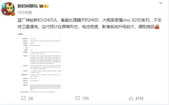 8月6日消息,根据@数码闲聊站的爆料,一款型号为V2405A的vivo新机已通过工信部无线电批准。只管具体上市名称尚未公布,但这款新机“大概率从属vivo X200系列”。新机预计将在屏幕形态、电池密度、影像系统等方面举行巨大升级,但不支持卫星通讯功能。 vivo X200系列的三款机型预计将搭载联发科天玑9400旗舰平台,采用台积电第二代N3工艺。此前有消息称,这三款机型最快将于本年10月与高通骁龙8 Gen4新品同台竞技,届时将为消耗者带来更高性能的智能手机体验。 本年5月,Arm公司更改了Cortex-X CPU系列的定名方式,Cortex-X4的继任者X925在单核性能上进步了36%(基于Geekbench测试)。同时,Arm还推出了新一代的Cortex-A微架构,包罗Cortex-A725和Cortex-A520,分别在性能服从和能效上比上一代产物提拔了35%和15%。 作为对比,vivo X100系列首发天玑9300处置处罚器,采用全大核CPU和12核旗舰GPU,内置天生式AI引擎的APU790。vivo X100尺度版配备了6.78英寸2800×1260超视网膜8T护眼微曲屏,峰值亮度高达3000nit,并支持全新夜猫护眼功能。此外,vivo X100系列内置自研蓝海电池,尺度版搭载等效5000mAh容量电池,Pro版为5400mAh,支持零电极速启动,手机没电时最快只需4秒便可从关机到亮logo。影像方面,vivo X100尺度版配备了三颗5000万像素镜头,蔡司超等长焦采用潜望式布局设计,f/2.57超大光圈加持,为用户带来杰出的照相体验。 此外@数码闲聊站还透露了vivo X200小杯的干系设置信息,举行一个简单的汇总: 尚未确定定名,网友暂称为vivo X200 Pro mini 屏幕:约6.3英寸,1.5K分辨率直屏 性能:天玑9400 影像:70mm 3X潜望长焦+自研影像芯片 续航:5500mAh电池,支持无线充电 编辑点评:如今来看vivo X200系列的设置照旧非常有竞争力的,尤其是如今小杯的设置非常给力,即有大电池也有潜望长焦和无线充电,等候后续的爆料能带来更多信息。 |