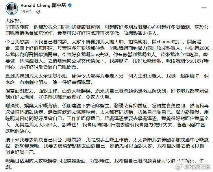 南都讯 记者蹇玥 克日,郑中基公布因个人感情及康健问题,决定在高雄演唱会退却圈休息。他发文回应此事,透露本身患有烦闷症,一开始靠药物治疗,但终极照旧选择喝酒躲避实际。接下来,太太会陪他去美国参加戒酒中心的疗程,“都五十几岁了,我要去想清楚怎样去面临本身,然后才可以面临大家,我希望返来之后可以做一个更好的本身。” 在公布退圈的同时,他还控诉本身的经纪人何庆湘“工作与道德操守有问题”,据郑中基成立的个人经纪公司机动娱乐发布的声明透露,何庆湘已于8月3日离职,他本人会在完成手头工作后暂时离开,机动娱乐旗下的频道“机动电视台RTV”和网店将会照常运作。 公开资料显示,郑中基是香港歌手、演员,本年52岁,出道近30年,曾发行《左右为难》《相思无用》《你的眼睛叛逆你的心》《绝口不提爱你》《别爱我》《无赖》等歌曲,还曾出演《家有喜事2009》《四台甫捕》《折扇探花》《皆大欢乐》《整容日记》《大话天仙》等作品。他与Twins成员阿Sa曾有一段短暂的婚姻。在公布退圈的文章中,他提到2000年在飞机上醉酒闹事让很多粉丝扫兴以及之前履历的短暂婚姻让他“不开心”,说本身“好好反省过本身的问题”。 郑中基与经纪人何庆湘合作凌驾10年,从郑中基成立本身经纪公司到开设个人频道,何庆湘都有参加,两人忽然停止合作的缘故起因,引发外界推测。 |