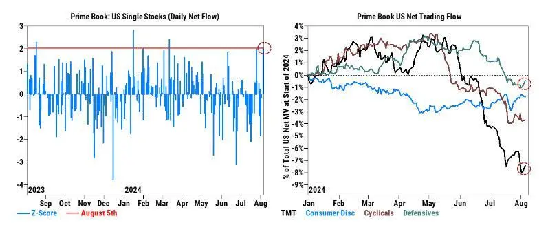 分行业来看,美国股市11个行业中,有8个行业得到净买入,以信息技能+防御性股票为首,防御性股票包罗医疗保健、必须品、公用奇迹等范畴,而消耗品、房地产和金融是净卖出的。 信息技能类股票出现自6月中旬以来最大的一天净买入,由多头买入和空头回补共同推动。周一,险些全部科技子行业都得到了资金净买入,其中半导体和半导体装备以及软件得到的买入规模最大。不外,科技硬件这一科技子行业没有得到净买入。 只管周一对冲基金大力大肆买入信息科技类股,但当前美国信息科技板块的多头/空头比率仍为1.81,靠近1年和5年的低点,详细来说,该比率当前处于第3百分位,这表明低于这两个时间段内记载的97%的全部数值,因此需要更多买入才气赶上均匀程度。 从高盛的经纪业务客户情况来看,他们对信息技能板块的持仓相比标普500低12.6%,还是10多年来的最轻仓程度之一。 除了美国,其他地区并没有感受到对冲基金的这种青睐。只管日本股市周一暴跌,日经指数重挫12%,但日本股票仍略有净卖出,资金流有序,空头卖出略多于多头买入,宏观产物的净卖出在很大程度上被个股的净买入所抵消。 高盛昨日公布的数据表现,停止上周五,对冲基金连续八周净卖出美股,指数和ETF净抛售由卖空推动。 财经金融博客Zerohedge提到,纵观近期对冲基金的业绩指标,有一些值得注意的事变:固然根本面类基金在上周遭受重创,使得其业绩表现回到了3月时的程度,而体系性基金则在大跌中根本未受太大影响。此外,在履历了几天令人市场巨震之后,对冲基金出现了持仓敞口的淘汰,这点符合预期。 从高盛最新数据来看,对冲基金们好像并没有过分担心导致克日市场暴跌的根本面因素,这与华尔街投行的警告并不一致。比方,美银发起投资者在美联储初次降息时果断卖出所持资产,以为市场对降息的预期过于乐观,而美联储初次降息后将会导致“更艰难的着陆”。摩根大通警告投资者别抄底,称和惯性对抗不明智。 周二,美股大反弹,标普500指数盘中涨超2%,科技、房地产、金融、工业、电信板块涨超2%。 |