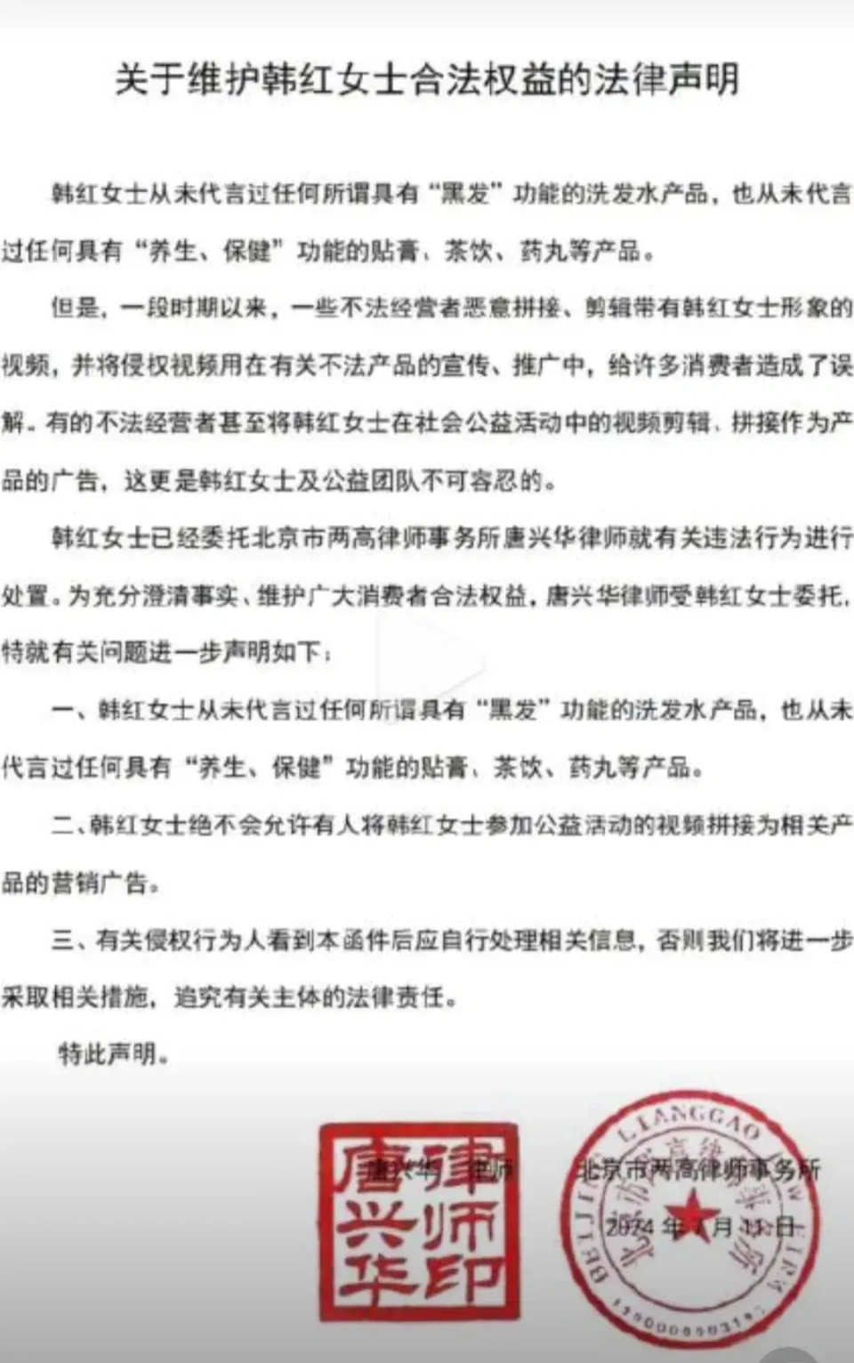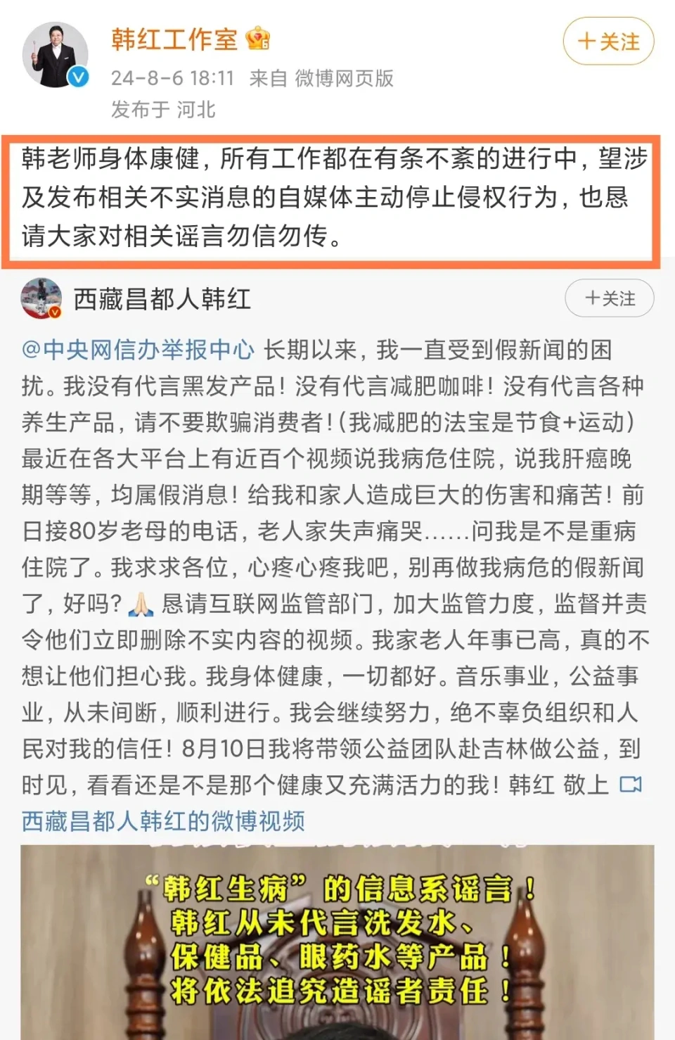 克日一向低调内敛、专注公益古迹的韩红忽然在交际平台上发长文辟谣各种假消息。 韩红表现从来都没有代言过黑发产物、减肥咖啡,以及养生产物,自己的减肥法宝是节食加活动。 别的让韩红最愤怒的是,近来各大平台居然有上百个视频说她病危住院,已经发展成了肝癌晚期,这些假消息已经给她和家人造成了极大的伤害和痛楚。前几天还接到了80岁老母亲痛哭流涕的电话,还问韩红是不是重病住院了? 对于网络上无休无止的假消息,韩红恳请各位网友心疼心疼她,别再传播病危的假消息了。家里老人年岁已高真的不想让他们再过多费心了,自己齐备都很好。音乐古迹、公益古迹,从未间断,都在顺遂举行。 之后韩红工作室也转发该辟谣博文,韩老师身材康健,全部工作都在井井有条地举行中。看得出来韩红这次是真的气愤了,隔着屏幕都能感受到她的愤怒和无奈。 之前就有很多短视频发布韩红病危的视频,不但配上虚伪浮夸的笔墨,而且尚有伤心的歌曲作为基调,如果不消心甄别真的很轻易上当。 尚有网友留言表现,婆婆前几天还问她韩红是不是病危了,而且对此笃信不疑,在一番表明下他们才知道是假消息。 从韩红的近照上看她确实瘦了很多,站在艺人薛之谦旁边都显得有些娇小了,固然尚有点双下巴,但是五官表面已经清晰很多了,有点大眼萌妹的既视感了。 也难怪有很多故意之人在上面做文章了,不外韩红本人也表现减肥就是管住嘴,迈开腿。 最新工作室发布了韩红回藏族故乡吃牛肉的视频,视频中韩红身穿赤色短袖头戴赤色棒球帽,手上戴着活动手表和佛珠,穿着妆扮简单随性。 韩红蘸着藏式辣椒粉,生吃牦牛肉,一边吃一边津津有味的为网友做着先容,堪比一场吃播视频。 别的尚有细心的网友发现韩红左手无名指上佩戴着戒指,岂非已经完婚了吗? 相较于韩红完婚,网友似乎更想知道韩红有没有向郝蕾要到孩子。在一次采访中,当被问到想过自己有一个孩子吗?韩红表现,在39岁的时间想过,看到很多朋侪都有小孩了。尤其是像郝蕾如许的人,臭不要脸还生了两个,然后不停跟她要二宝,她也不停不给我。 现在52岁的韩红还是形单影只,没有完婚也没有孩子,险些全部的时间都奉献给了公益古迹,正如她所言渴望各人不要再发布她的假消息了,让她和家人可以好好生存,安心工作! |