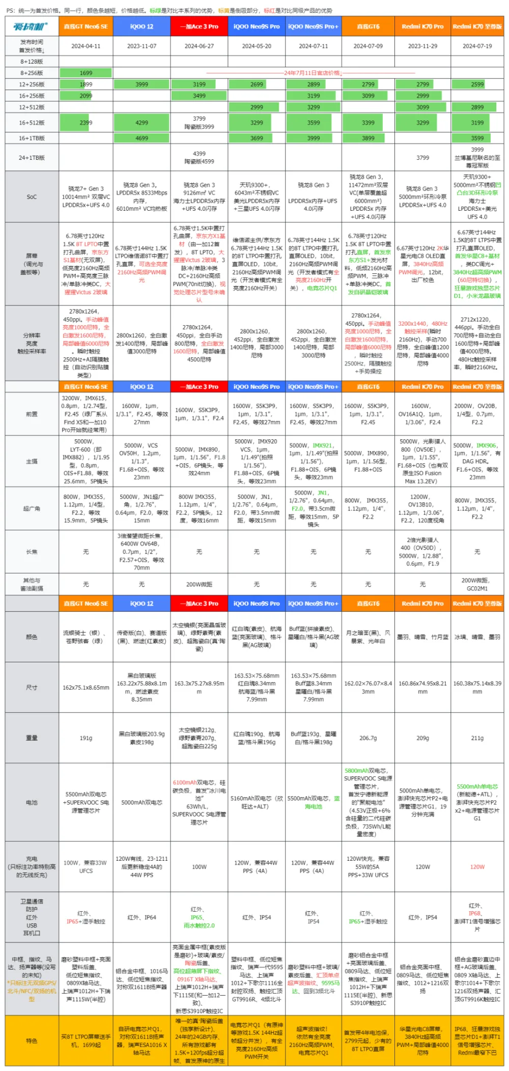 欢迎收看憋了3个月,直到8月7日才更新的手机保举。 商家显着都在“备战”七夕,近来纷纷涨价,再叠加暑假涨价的老毛病,让本不自制的代价雪上加霜。 对比5月尾,除了几台机型的个别配置低1、200元,别的所有机型全部有100到400元不等的涨幅。留意,是全部。看来确实是上游涨价了,我们搞手机保举4年来,照旧第一次遇到这种齐刷刷涨价的环境。 “好嬲,我真喺好嬲”,物理茅台贬价了,电子茅台倒满地都是。 预计这样的环境不停要维持到10月尾,618上车的用户都笑成耐克嘴了。 iPhone例牌会是9月发布,骁龙8 Gen 4新机预计10月尾开始出来,天玑9400新机应该是11月初开始出来,但它们大概都会有300到500元的涨价(4299元起?)。 而Find X8 Ultra、小米15 Ultra、vivo X200 Ultra那些影像旗舰,最快也要来岁初。 拼多多、淘宝、第三方店家报价都会比官店自制,但缺乏同等性,故同一用8月7日的京东自营报价。手机代价变动较大,仅供参考。 200元以下:非智能机诺基亚新105 4G ↑ 非智能机这边并没厘革,而且预计1年内都未必会有厘革。 非智能机,只保举200元以下的,别买2G版!(2G退网,大部门地域用不了)。 预算凌驾200元都闭眼保举TCL T508N(这3个月又涨50,如今代价已经250了。可root的5G手机,安卓13体系,啥APP都能跑,3.5英寸屏幕+实体按键+展锐T157)。 尊长用的话,更保举翻盖机,别买卡片型的弟子手机(电池小,常常要充电)。 中兴保卫宝K210,149元(直板机,带定位功能,4G全网通+双卡) 金立M8,178元(翻盖,2.8英寸内屏,有基站定位功能。金立V3、V16、W21那些都是有点年龄的贴牌模具,大差不差。乃至酷派还有台199元的K60 4G,外貌差异,但功能都差不多)。 诺基亚新105 4G,179元。时隔3个月,暴跌20元!(别买2G版!很多地方用不了。有付出宝付出码付款,外貌乃至有点小帅。像是诺基亚215、诺基亚新150都是差不多代价,看外貌喜好选) AGM M9,199元的三防机(有尊长版,4G双卡,1.8米防摔+1.5米防水,IP68,要是有翻盖就更好了) 1000元以下:忽然没得选中兴远航41,紫光T760,4+64版429元 除非预算动不了,否则发起6GB内存与600元起跳,体验会强很多。 之前299元的中兴畅行40SE官店没货了,且大量百元机涨价,导致这区间剩3台机型,史上最心伤的一期,没有之一。 1. 中兴远航41,紫光展锐T760,4+64版429元(竟然用上紫光T760,超速了!它有4颗2.2GHz的A76大核,比骁龙4 Gen 1、天玑700/G99、骁龙680都强,绝对轻松秒杀附近价位的荣耀畅玩20(紫光T610)和Redmi 12C(联发科G85)。6.52英寸90Hz LCD水滴屏,5000mAh电池+10W充电,1300万像素主摄。有桌面简易模式,有FM收音机功能) 2. Redmi Note 12,骁龙4 Gen 1,8+128版769元,8+256版799元,比天玑6020的荣耀Play7T强(6.67英寸120Hz的1080P+三星OLED直屏,4800万像素主摄,主摄5000mAh电池+33W快充) 3. 努比亚小牛,紫光展锐T760,6+256版799元,8+256版899元(和上面的远航41同芯片,这下明白远航41有多超速了吧。卖点是1亿像素1/1.67型的三星HM6主摄,百元照相。6.54英寸120Hz 1080P+的LCD直屏,5000mAh电池+10W环保充电,正反面都是玻璃) 1000元到2000元:空荡荡真我GT Neo6 SE 这个价位段的主题,也是涨价,涨价,照旧TM涨价。 按定位梯度,是骁龙6 Gen 1/骁龙7 Gen 3,然后到天玑8100/8200/8300,再到骁龙7+ Gen 2,末了到骁龙7+ Gen 3。 但iQOO Z8(天玑8200)和Redmi Note 12 Turbo(骁龙7+ Gen 2)都涨到1500,就不用看了。 1. iQOO Z8x,骁龙6 Gen 1,8+128版999元,8+256版1099元(虽然是三星4nm,但好歹是4颗大核,性能比骁龙695/天玑7050/天玑1080/天玑900/700强。6.64英寸120Hz 1080P+LCD,6000mAh充电宝级电池+44W快充,5000W主摄,199.6g重) 2.Redmi Note 12T Pro,天玑8200-Ultra,12+256版1199元(LCD永不为奴!但大部门地域都没货了。8.87mm,200g,6.6英寸144Hz 7档变速LCD。5080mAh电池+67W快充。1600W前置,6400W的OV64B主摄+800W超广角,耳机口、红外、IP53应有尽有)。 2. Redmi K70E,天玑8300-Ultra,12+256版1549元。天玑8300和骁龙7+ Gen 3有性能代差,实在更发起加钱变强(6.67英寸1.5K无塑料支架的直屏OLED,6400W OV64B OIS主摄+800W超广角,5500mAh电池+90W快充) 3.真我GT Neo6 SE,骁龙7+ Gen 3,12+256版1749元,16+256版1799元,16+512版2099元(入门版比3个月前涨了150元,还不如中配起跳或去看看PDD。比Redmi Turbo 3、一加Ace 3V强。肯定要直屏的话,那看看涨到1829起的iQOOZ9Turbo)(就是来卖曲屏和7+G3的,和GT5 Pro同级的真·越级京东方1.5K 8T LTPO曲屏,5500mAh电池+100W快充,LYT-600 5000W OIS主摄+800W超广角) 2000元到3000元:最热闹的区间2000元档照旧骁龙8 Gen 2的天下,有IP68的K60至尊版(天玑9200+)基本退市。 1. Redmi K70,骁龙8 Gen 2,12+256版2199元,16+256版2399元,12+512版2499元,16+512版2699元,16+1TB版3099元(比618贵200元。附近唯一的2K屏,重要缺点是续航偏弱。外貌和K70 Pro版同等,只是铝合金中框改成磨砂。6.67英寸120Hz 2K华星C8直屏,3840Hz高频PWM。首发光影猎人800(5000W,1/1.55",1μm,带OIS)+800W超广角,5000mAh电池+120W快充) 2. 荣耀90 GT,骁龙8 Gen 2,12+256版2059元,16+256版2298元,16+512版2704元,24+1TB版3363元(虽然是单频GPS,主板也有点抠,但端赖涨价200到300元的iQOO Neo9陪衬。维信诺独供6.7英寸120Hz 1.5K中置打孔直屏OLED,5000万像素索尼IMX906的1/1.56型OIS主摄,5000mAh单电芯+100W快充) 3. 一加Ace 3,骁龙8 Gen 2,12+256版2388元,16+512版2702元,16+1TB版3299元(比618贵200左右,附近唯一的曲屏保举,留给不喜好直屏的用户。实在就是换金属边框、加大电池、减弱马达/快充的一加Ace 2 Pro,依然有附近唯一的高位超薄指纹。1.5K京东方曲屏,5000W IMX890 OIS主摄+800W超广角,5500mAh+100W快充)。 4.魅族20 Pro,骁龙8 Gen 2,12+25