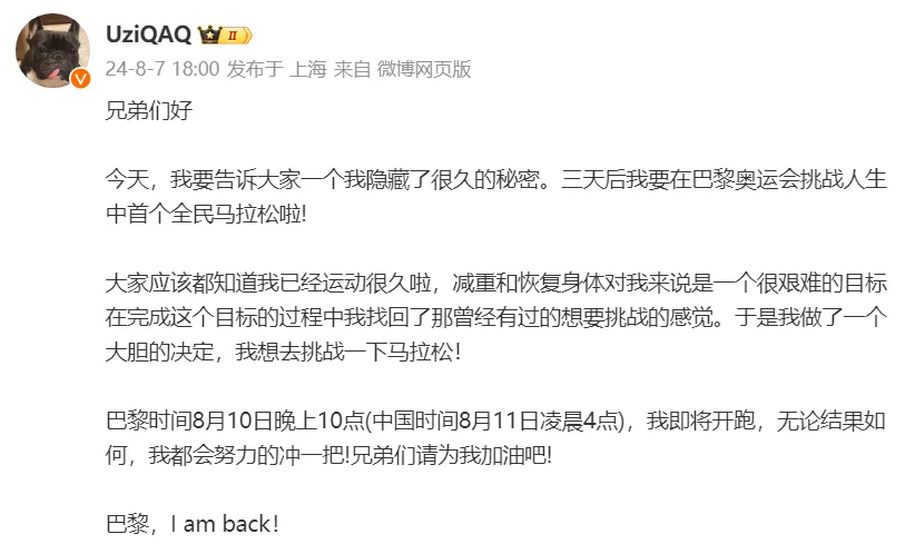 雷竞技资讯: 谈起Uzi,各人脑海中大概想起的照旧谁人小胖子。他利用好,脾气大,常常喷队友挂机,也爱吃零食。其实随着时间的推移,日渐成熟的小狗,已经将曾经贴在身上的标签全部剔除。 自从抱病退役后,他就不克制的举行锻炼健身,现在到了2024年,彻底告竣了他的目的。狂减了八九十斤不说,乌兹还爱上了跑步运动,现在一身的肌肉,跟昔日小胖子形象太差地别。 就在克日,Uzi也公布了一个庞大消息,他长文公开,表现自己将到场巴黎奥运会,去寻衅人生中第一个马拉松比赛。全程四十公里,平凡人连对峙都做不到,唯故意坚志刚且身材素质极佳的人,才能完成这一寻衅。 云云劲爆的消息也点燃了电竞圈,很多着名主播以及LPL讲授主持都表现惊奇,感觉乌兹搞了一波大的,成了首位到场奥运项目的电竞选手(Uzi自EDG复出后还没退役)。 固然已经不太大概在赛场上看到Uzi了,但能在奥运舞台看到小狗继承拼搏,无论是粉丝照旧观众都非常欣慰。电竞模范的气力不止存在于游戏,褪去光环,脱离主战场后,乌兹仍然能用现实办法来鼓励全部粉丝,只有坚刚不可夺其志的顶级选手,才能做到云云田地。 不知道各位小同伴怎样评价Uzi到场奥运会,你们会感到敬佩吗? |