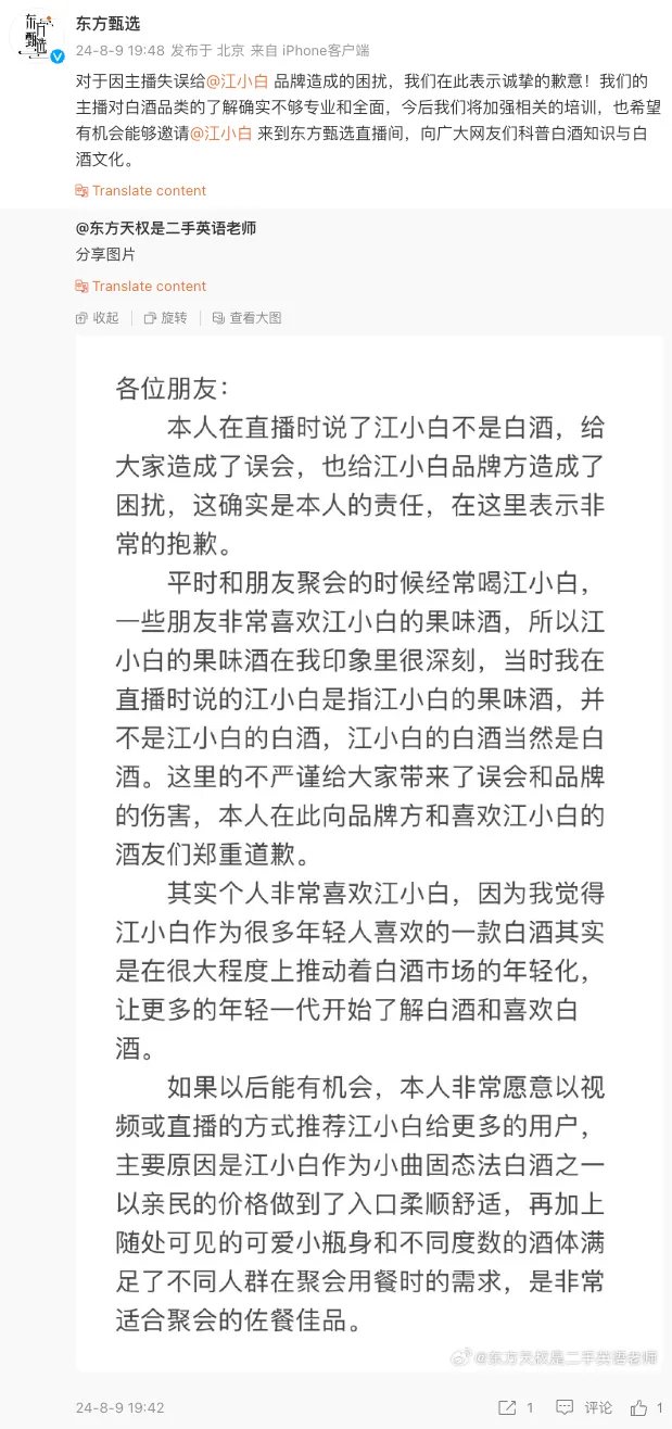 8月9日晚,东方甄选主播天权发布致歉信,称其在直播时说了江小白不是白酒,给大家造成了误会,也给江小白品牌方造成了困扰,这确实是本人的责任,在这里表示非常的歉仄。“其时我在直播时说的江小白是指江小白的果味酒,并不是江小白的白酒,江小白的白酒固然是白酒。” 随后,东方甄选官方微博也发文向江小白表示歉意。东方甄选表示,主播对白酒品类的相识确实不敷专业和全面,以后将增强相干的培训。“对于因主播失误给江小白品牌造成的困扰,我们在此表示诚挚的歉意!” 今日稍早些时候,重庆江小白酒业有限公司发布声明称,江小白酒业旗下所有白酒产品,均接纳纯粮固态发酵酿造工艺,酿造质料只有水和高粱,产品实验尺度为代号GB/T26761(优级)的小曲固态法白酒国标。公司所有白酒产品的酿造质料、酿造工艺(纯粮固态发酵)、以及实验尺度(GB/T26761)均已在产品包装上明白标注,无任何遮盖或误导举动。 江小白酒业在声明中称,东方甄选主播天权在带货过程中,以其“三级品酒师”的身份,发表严肃背离究竟的言论,误导斲丧者和拉踩江小白品牌,陵犯了公司的合法权益。对此,公司已向相干主管部分举行投诉,要求东方甄选就此事做出公开致歉并消除影响。 |