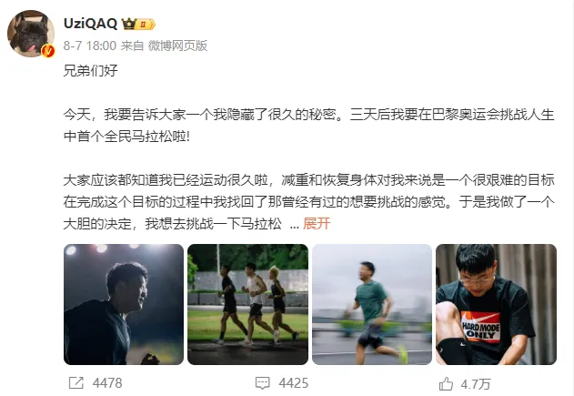 LOL电竞选手Uzi,于8月7号发文公布,到场巴黎奥运会全民马拉松。 此消息一出,刹时在电竞圈引发热议,要知道马拉松全程要跑42.2KM,期间不能停歇,即便是常年对峙跑步这项运动的人,看到这组数字,都得掂量一下本身的身体情况,能不能撑得住,更别说常年高强度练习,久坐不动的电竞选手了。 而本届巴黎奥运会,全民马拉松的参赛资格,就足以劝退99.9%的人了。 从2020年7月,到2023年12月期间,以运动的方式,得到10万积的运动员,才有报名参赛的资格,而这10万积分,对应的跑步公里数,是一万公里,告竣这项成绩有多难呢? 上海到北京直线间隔1068公里,一个来回合计2136公里,也就是说,你得来回来回5次,才华到达1万公里以上,就算解锁了10万积分,也不能直接到场,还得抽签,由于报名人数高达80多万,末了只有4万多人能参赛,中签率大概是5%左右。 Uzi堪称天选之人,在80万人的抽签里,被选中参赛。 8月11日破晓4点,巴黎全民马拉松正式开跑,Uzi不负众望跑完全程,总计里程数41.195公里,用时5小时41分35秒,乌兹能顺遂跑完,真的超出全部电竞玩家的预料了,在电竞圈的运动范畴,他绝对是好汉联盟汗青上的第一人了,乃至说电竞第一人也不浮夸。 跑完全马身体素质得有多强?大概许多电竞的玩家,都没什么概念。 客岁全国完玉成马的,只有64万人左右,匀称2181个人里,才有一个人能跑完全马,42公里,平凡人就算是走路,都很难走完全程,更别说期间还得偶然小跑了,只能说乌兹如今的身体素质,是真的已经刁悍无比了,绝对能复刻宿舍一踢五名局面。 Uzi的运动之路,算是实际版的“热辣滚烫”了,大部分LOL玩家,都想不到,谁人曾经职业赛场上轻易红温的小胖子,如今已经是肌肉型男了,在打职业期间,Uzi的身体情况确实很差,不规律的作息、饮食习惯、高强度的练习,让Uzi很早就患上了职业病。 常年握鼠标手部患上腱鞘炎,更严厉的是,Uzi还患有糖尿病。 这些伤病也是Uzi退役的重要缘故因由,幸亏脱离赛场之后,Uzi对峙锻炼、治疗,身体变得越来越好了,这次跑完全马,也算是给电竞玩家带来鼓励了,以后碰到困难想退缩的时间,咱就想想乌兹,人家都能对峙锻炼,跑完马拉松,还有什么事变是做不到的呢? 结语:作为电竞老观众,说实话真挺敬佩乌兹的,他的游戏天赋让人倾慕,这个咱们确实比不了,但一连锻炼身体,到达能跑完马拉松的强度,他的这种对峙、毅力是值得咱们学习的,对比隔壁身体越来越差的DYS,简直是高下立判了。 对于Uzi跑完马拉松,你们作何评价呢? |
