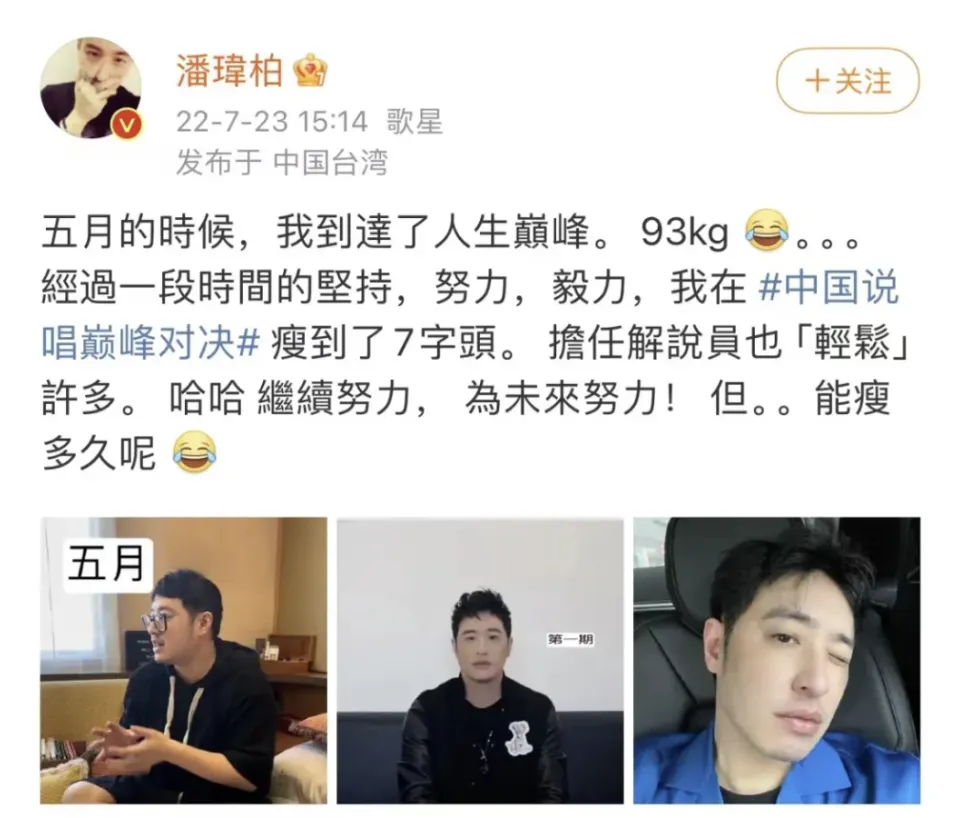 开头先来两张图暴击↓ 留意,这不是杜海涛!也不是韩红老师! 是的,他是潘玮柏! 一个不留意,潘玮柏悄悄地胖到了200斤,给各人带来了亿点点震撼。 前两年上《披哥》由于重新吃到尾喜提新外号“肥仔”,但也没有胖得那么浮夸。 本年的他是真的胖到认不出。 (真的很像外套内里还套了件羽绒服) 舞姿也是相称鸠拙和厚重,乃至让人幻视韩国鸟叔。 难为工作室发的舞台照还给他修出了下颌线↓ 对比原图,真实的潘玮柏得是他的1.5倍,修图师配享太庙[赞] 网友也纷纷玩起了梗,给潘玮柏取了连续串的外号,“潘玮厚”、“潘伪薄”、“胖围脖”等。 “潘帅”变成了“潘桃”↓ 跟旺仔牛奶卡通形象撞脸↓ 哥,控制一下本身,不能再胖了,再胖16:9的屏幕都放不下了啊。 别以为他是中年发福,潘玮柏辟谣了他不是中年发福,明明他一生都在发福,是个天生发福体质,轻微不控制过个年就轻轻松松胖20斤的那种。 中学时期就由于长得太结实被同砚起外号“小肥”,有段时间胖成绿巨人浩克,朋友都认不出来。 他也力证了“胖子都是潜力股”的定律,瘦下来就颜值飞升,“潘帅”的外号不是浮名。 发福体质还特别爱吃,双层buff叠加下,就成了我们如今看到的样子。 看他吃的早餐,一碗羊肉面,一个东坡肘子,一个芝士葱烩包,一个鲜肉方糕,3个萝卜丝饼,尚有一杯乌梅汁,一早上吃这么多才胖成这个样子…… 用网友的话说,按照他的吃法,我三天就得出栏。 讲真的,潘玮柏是圈里少见的能在节目上放开膀子吃的艺人。 上访谈节目,节目组给他预备了暖锅,高兴得大快朵颐,而且直言比拿到奖还开心。 上《锋味》只顾着吃,结果吃得太大口,把本身给噎着了,还被谢霆锋吐槽。 上《潮流合伙人》用饭也是吃得嘎嘎香,胃口好到不可。 上《披哥》,一个人吃了二十多道菜,重新吃到尾,扫到他的一泰半镜头都是见他开开心心地在炫美食,同组的哥哥都瘦了,只有他吃胖了。 与圈里那些明明是在节食减肥,但是还营造热爱美食的艺人不同,潘玮柏对美食的虔敬是肉眼可见,见到美食就两眼放光,光是看他吃东西就能勾起人的食欲。 (不唱歌转行当吃播,肯定也能发展得很好) 易胖又爱吃,常常放飞自我,但是也没有完全放弃身材管理。 他是个易胖体质,但同时也是个易瘦体质,到工作必要的时候又会减肥。 每到发歌时期,他都会举行减肥瘦身,由于拍MV必要比较犀利的眼神,假如胖眼神还犀利很轻易看起来像是胖子在生气。 他还认真地演示一遍给观众看,不得不说他说得真的很对,瘦+犀利的眼神就是酷帅的样子,胖+犀利真的就像是在生胖子,看起来憨憨的。 2022年为了上《披哥》特意减肥,快200斤的他,用了两个月的时间瘦到150斤。 对比还是挺显着的。 他就属于吃的时候就开开心心地吃,但是必要瘦下来的时候,又很有减肥的决心,不碰高热量的食品,康健饮食+运动健身,一个月乐成减肥八公斤。 在胖跟瘦之间反复横跳,偶然候看着特别胖,但隔段时间必要出镜时又变得棱角分明。 3个月前他开演唱会胖成球,但前不久有网友遇见他录制综艺,人又瘦返来了,下颌线又出来了。 人也变得清新不油腻了。 他的体质真的蛮神奇的,忽胖忽瘦,脸居然也没垮,只要瘦返来就又变帅,有的人减肥之后轻易出现脸垮,皮肤松懈的环境,但他好像没有这个困扰。 为了康健,潘玮柏的这种比较极度的身材管理方式咱们还是不要盲目模仿。 |