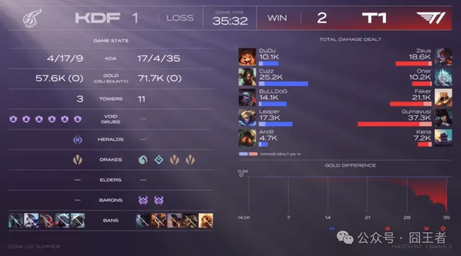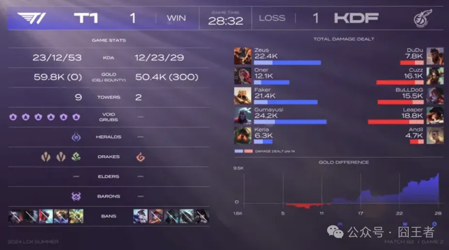 在LPL处于季后赛大战中时,LCK也火如荼的大战。8月14日,LCK那边睁开了两场比赛,一场KT大战DRX,一场是KDF大战T1。 在率先竣事第一场比赛中,KT以二比零的比分,为自己的夏季赛之路,画下了刚强的一笔。至于第二场KDF大战T1的比赛,毕竟会打成怎么样,让我们一起来相识一下吧。 Gumayusi女警接受比赛,T1让一追二锁定季后赛根据8月11日竣事的来看,T1排在积分榜第四的位置,KDF排在第七。,KDF要想继续参加LCK的季后赛的话,击败T1是关键。但问题是,固然T1近期状态不佳,特别是Faker状态更是“宿病又发”,但T1就是T1,想击败他们,谈何轻易。不外幸亏,电子竞技是个球体,不到末了一刻,谁也不能说谁一定能得胜。 第一局比赛,KDF蓝色方,禁用卡莉斯塔、莉莉娅、艾希、凯南、杰斯,选用鳄鱼、豹女、阿萝拉、伊泽瑞尔、蕾欧娜;T1红色方,禁用小炮、大树、兰博、奎桑提、布隆,选用纳尔、瑟庄妮、永恩、女枪、芮尔 效果第一局比赛,被两队打成了中分秋色,不外KDF笑到了末了。比赛前期,T1上野联动打开局面取得2k经济领先,但KDF控下三条小龙;比赛第24分钟左右,两队爆发龙魂团。T1逐个进场被击退,KDF一波打出0换3大胜拿下风龙魂。Gumayusi女枪抢下大龙但又被KDF一波打出0换3;比赛第30分钟左右,两队在中路爆发鏖战,BuLLDoG阿萝拉狂两个,DuDu鳄鱼正面力抗T1上中资助KDF一波打出2换4;终极比赛第33分28,KDF拿下大龙打出0换3后,一波竣事比赛。 第二局比赛,T1蓝色方,禁用小炮、大树、永恩、伊泽瑞尔、泽丽,选用兰博、蔚、沙皇、韦鲁斯、泰坦;KDF红色方,禁用艾希、莉莉娅、卡莉斯塔、赛娜、女警,选用奎桑提、豹女、阿萝拉、女枪、芮尔 效果第二局比赛,打成了T1单方面的碾压局。比赛前15分钟是KDF略占上风,比赛第16分钟左右,BuLLDoG阿萝拉先手被反打,T1一起反击打出0换5大胜;比赛第23分钟左右,两队爆发小龙团。T1一起追击到下路打出1换4大胜拿下大龙;比赛第25分钟左右,KDF偷掉T1双C,Oner蔚怒砍三杀资助T1反击打出2换3;终极比赛第27分钟左右,两队在下路爆发团战。Zeus兰博砍下三杀资助T1一波打出2换4后竣事比赛。 决胜局,KDF蓝色方,禁用卡莉斯塔、艾希、蔚、韦鲁斯、赛娜,选用纳尔、豹女、小炮、伊泽瑞尔、泰坦;T1红色方,禁用大树、兰博、奎桑提、鳄鱼、蕾欧娜,选用阿萝拉、佛耶戈、沙皇、女警、布隆 效果决赛局的比赛,被T1打成了单方面的局。T1对线期控下三条小龙打出上风。比赛第23分钟,T1小龙团打出1换2随后顺势拿下大龙;比赛第29分钟左右,两队爆发龙魂团。T1残血拉扯中打出1换3大胜拿到土龙魂;终极比赛第35分32秒,T1中路推进打出0换4后一波竣事比赛。 T1在击败了KDF之后,就提前锁定了季后赛;而KDF战队,则还需要奋斗,还没有锁定季后赛。在本局比赛中,固然Faker的体现一样寻常,但他的沙皇,仍旧给安心的感觉。 |
