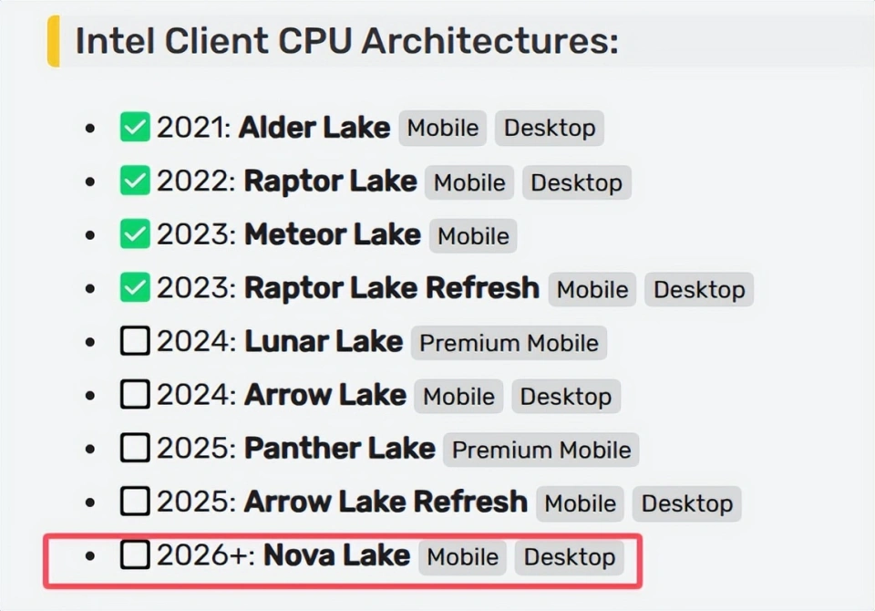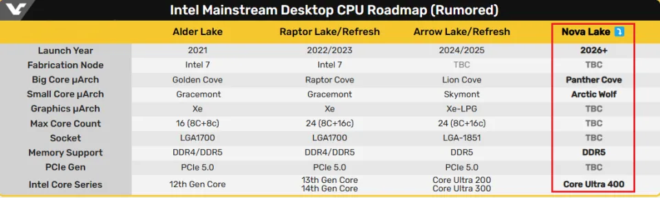 提起“Nova”这个英文单词,相信许多数码科技爱好者朋侪都非常熟悉。 “Nova”一词泉源于拉丁语,有以下几种常见的不同的寄义:在天文学范畴,它指的是新星,也就是亮度忽然增长的恒星,然而许多数码科技类产物大概软件都喜好用“Nova”一词定名。 比如说华为有Nova系列手机,另有一款着名安卓启动器叫Nova launcher,别的,另有一家奥地利的滑翔伞品牌也Nova,国内另有一家童装品牌也叫Nova。 现在,“Nova”家族将迎来一位新成员,又有一家重磅级科技公司也将在其产物定名中利用“Nova”一词,这就是英特尔公司。 资深数码硬件爱好者朋侪都知道,英特尔每一代处理器都有一个代号,根本都以“Lake”一词末端,比如即将到来的“Lunar Lake”和“Arrow Lake”,另有近期曝光的“Panther Lake”系列。 现在已知,“Lunar Lake”这个产物是面向条记本电脑的处理器,“Arrow Lake”系列既有面向条记本电脑的处理器,也有面向台式机电脑的处理器,两种类型都有,关于这一点,现在已根本实锤。 那么,“Panther Lake”系列呢?克日坊间有部门关于这方面内容的曝光。详细而言,和Lunar Lake系列类似,Panther Lake系列也仅只有移动版本,没有台式机版本,是面向条记本电脑的处理器。 那么,下一代面向台式机电脑处理器的代号是什么呢?答案是“Nova Lake”,——是的,你没有看错,更正确的说是“Nova Lake-S”系列。这个消息的可信度非常高,上图为戴尔的产物门路图,此中明白的提及、标注了“Nova Lake”系列。 现在已知、确定的是,Lunar Lake系列处理器将于9月3日正式发布,其重要目标是用来赋能驱动“Copilot+ PC,用于和高通的骁龙X系列和老对手的Ryzen AI 300系列处理器竞争。 关于Arrow Lake系列处理器的发布时间,现在还没有可靠的消息,现在坊间主流的说法是将本年下半年、年内发布,比力笼统,详细日期未知。 预计Panther Lake和Arrow Lake Refresh系列系列处理器将于2025年发布,Nova Lake系列处理器的发布时间大概在2026年以后了,还比力迢遥。 现在有坊间传闻称,英特尔将评估台积电的节点及其自身的Intel 14A 工艺技能,以确定用哪种工艺制造Nova Lake系列处理器。别的另有传闻称,Nova Lake系列处理器还将搭载代号为Druid的Xe4架构核显,大概被定名为Core Ultra四百系列。 末了一个值得关注的标题是Nova Lake系列处理器的接口是否会发生变革,也就是说用户是否须要更换主板?综合现在已知的信息来看,这种大概性不大,Nova Lake系列处理器大概率仍会采用LGA 1851接口,兼容800系列主板。 总的来说,Nova Lake系列处理器现在尚处于早期爆料的PPT阶段,已知信息非常少,小编将在第一时间分享更多相关动态和爆料,敬请关注。 |
