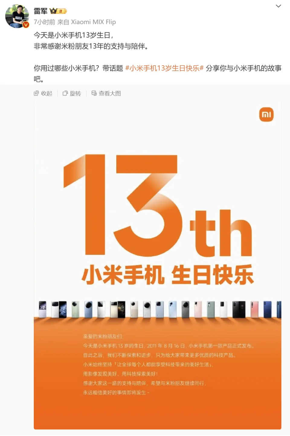 8月16日消息,2011年8月16日小米正式发布首款产物——小米手机1,隔断本日恰好已往13年。本日,雷军也在微博发文庆祝小米手机13岁生日。 在已往13年,小米发布了多款智能手机,信赖你或你身边的人一定有用过小米手机,那么哪款让你印象深刻呢? 除了已往13年发布的手机以外,小米最新旗舰也在路上了。根据网上信息,小米15系列将于10月份正式发布。值得一提的是,小米15将新增亮银配色。 在2017年发布的小米6上,小米首次推出亮银探索版,依附极具未来感和科技感的外貌,该机在发布后瞬间成为网友讨论的热门,也导致一机难求。 在时隔7年后,亮银探索版很有大概再次在小米15上呈现。 |