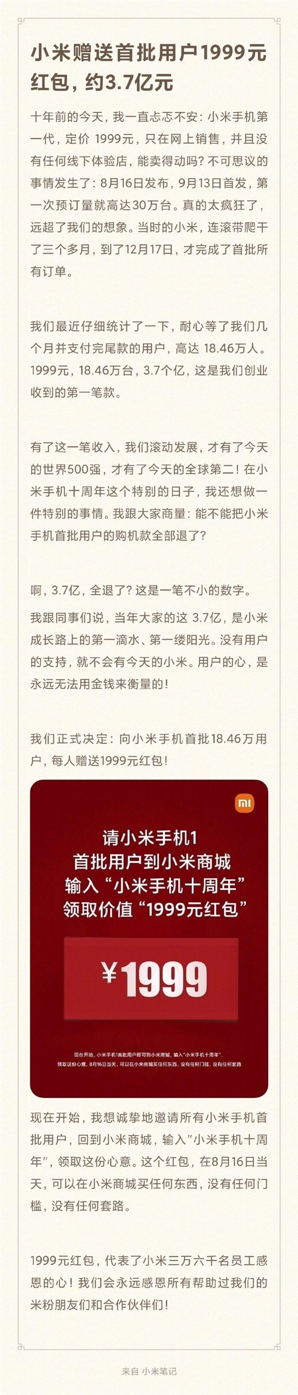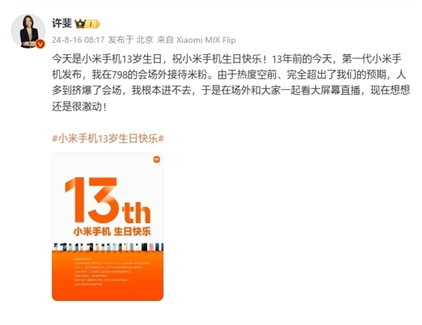 快科技8月16日消息,本日是小米手机13岁生日,在2011年8月16日,小米手机第一款产物正式发布。 小米团体CMO许斐发文表示,13年前第一代小米手机发布会时,自己在798的会场外接待米粉,由于热度空前、完全超出了预期,人多到挤爆了会场。 末了许斐自己都没能进去会场,在场外和各人一起看的大屏幕直播。 实在当年小米1发布的时间,所有人都没有想到,这将掀起整个国产手机行业的厘革,直到本日国产手机行业已经领先环球。 尤其是当年发布会上震惊全场的1999元订价,一上来就给当时的手机市场扔了枚炸弹。 1999,也成了后续几代小米数字旗舰的经典订价。 许斐作为小米46号员工,甚至当年还贡献出一段金句广为流传:我们做手机就是为了不赢利卖给各人呀”。 固然经常被网友讥讽,但实在小米也算是做到了如许。 当时国内的高端手机售价均在4000元以上,几乎被索尼、LG、iPhone、三星等科技巨头垄断,国产物牌多数是鱼龙稠浊的盗窟机。 小米手机以1999元的订价彻底改变中国智能手机市场格局,之后的红米手机又几乎终结了盗窟机的运气。 而且小米至今依然对峙硬件不超5%毛利。 当然了,要说小米手机的生日,就不得不提雷军在2021年的年度演讲上,在小米手机10周年的的吊唁节点,向所有小米1代用户退还了1999元红包,轰动一时。 |