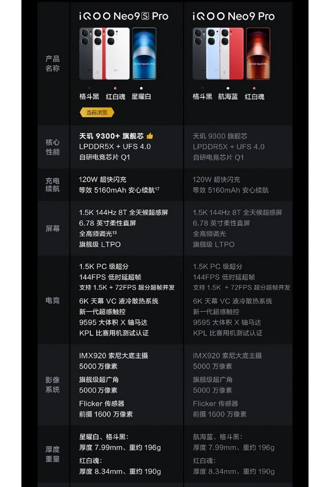 提起3000元价位,选择天玑9300+处置惩罚器的手机,现在大家能想到的就是两款,红米K70至尊版,以及iQOO Neo9S Pro。这两款现实上不是一起发布的,Neo9S Pro5月份就登场了,而红米K70至尊版则拖到了7月下旬。 但现在从某电商平台看,两者热度差距很大,红米K70至尊版有10万+批评,而iQOO Neo9S Pro固然早发俩个月,但现在是5万+批评。 为何会有如此大区别,我们来分析分析。 起首,定名让iQOO吃了大亏。 iQOO Neo9S Pro这个名字不敷霸气,Neo一样寻常是反面Ultra在一起的,一个体现新生,一个是至尊,差异不小。 而红米不管是中文,照旧英文,都给足了K70至尊版面子,让人很清晰就能确定其定位。现实上,红米通过更公道的定名,赚了两波眼球。第一波是K70三款机型登场,热度极高。然后是几个月后K70至尊版,配以什么样的名称,也不影响老产物的的销量了。 其次,就是做工上也是红米高级一些。 这一次,红米K70和K70 Pro都是金属中框,以是这个K70至尊版不大概是塑料中框,终极也确实是金属中框,如许产物格感就直接拉起来了。 反观iQOO Neo9S Pro,固然是Pro,固然是天玑9300+,但照旧塑料中框,多少拉了后腿。现实上,全部人都知道金属中框会增加本钱,但不相信会增加到厂商无法负担的地步,终极用什么材料,照旧厂商对这款产物的定位决定的。 以是相比之下, 固然iQOO也很器重,但好像是红米更器重这款产物。 固然,固然红米这次赢得很彻底,但两家竞争掖掖仪一个阶段,立刻10月高通新品到来,就又要有一波大战了。只是从这两款对比我们也能看出,狭路邂逅,谁用狠招谁盛,这也是符合竞争规律的吧。 末了我们回顾下配置,先看看iQOO的。 iQOO Neo9S Pro用的是天玑9300+相比于天玑9300,LPDDR5X,以及UFS 4.0也都是具备的,起始就是12+256GB版本。其自研的Q1电竞芯片可以让大型游戏从60帧超帧到144帧,并对游戏支持超等分辨率技能。 屏幕是6.78英寸直屏,2800x1260像素,LTPO 1-144Hz智能高刷,1400nit全局引发亮度,2160Hz高频调光。配置了6043平方毫米的VC均热板,覆盖焦点热源。 照相上,主摄是IMX920,5000万像素,1/1.49英寸,支持OIS防抖,另有5000万像素超广角摄像头,COMS是JN1。 产物有5160mAh电池,120W快充,增强WiFi天线,总重量196克,提供三种配色。 再看看红米K70至尊版的配置。 K70至尊版接纳了天玑9300+处置惩罚器,4nm工艺,12nm狞恶游戏独显D1芯片,LPDDR5x内存,UFS 4.0存储。 6.67英寸1.5K屏,2712*1220像素,144Hz高刷,触控采样率最高480Hz,60nit以下3840Hz PWM调光,全局引发亮度1600nit。 主摄为IMX906,支持OIS,1/1.56英寸CMOS,f/1.6光圈。另有800万像素超广角,200万像素微距。支持8K 30P,4K 60P视频。前置2000万像素人像摄像头。 有立体声双扬声器,5500mAh电池,120W快充,Wi-Fi 7,蓝牙5.4,金属边框,龙晶玻璃,IP68防水,重量211克。 |