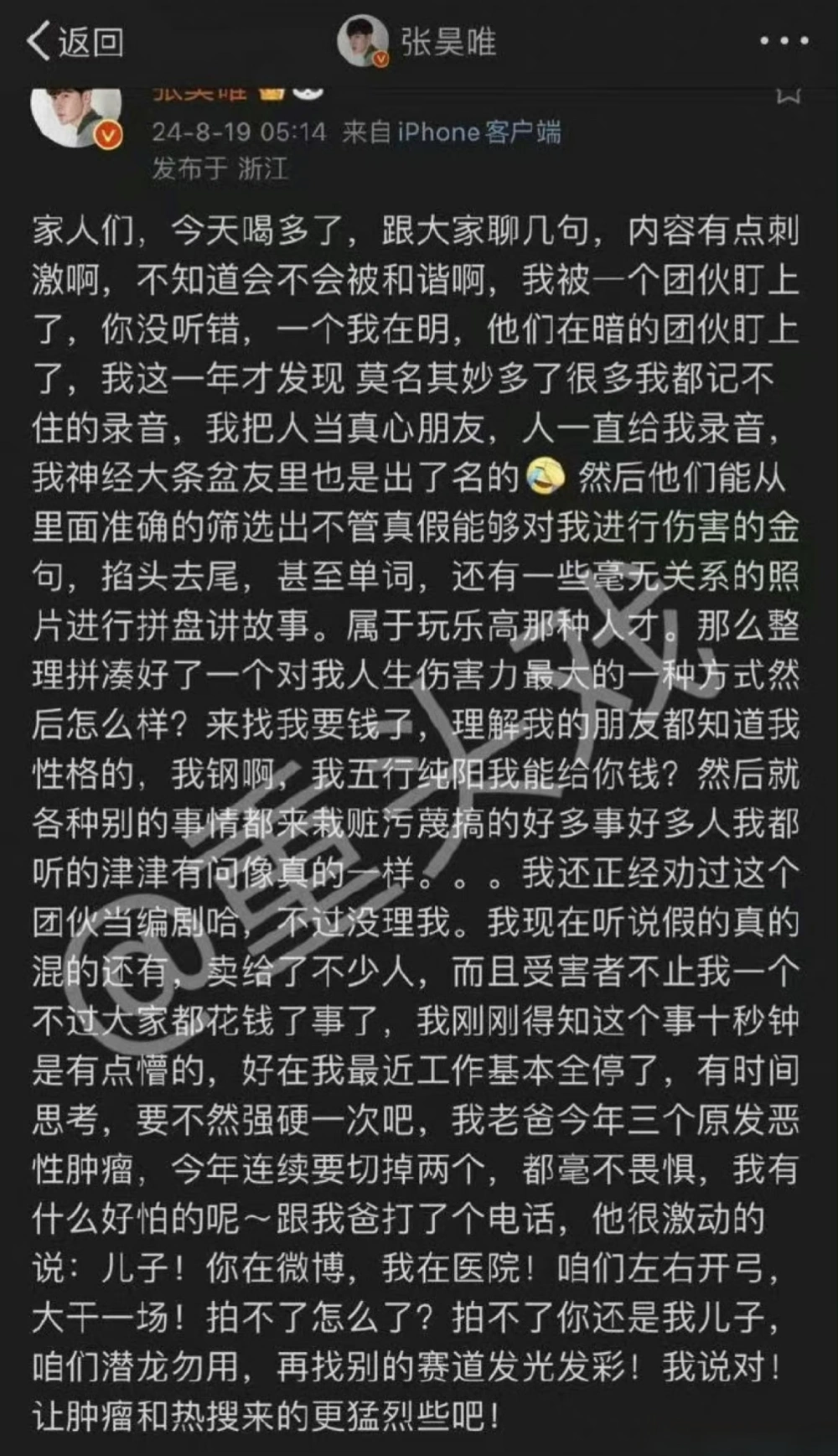 中国有自己的李胜利,那就是《庆余年》里太子的扮演者张昊唯。 前不久张昊唯和朋侪聊天的灌音被曝光,造谣戴向宇嫖娼后发文否认且致歉。 这件事导致戴向宇古迹停摆,迫使他晒出无犯罪记录证明来澄清自己。 而张昊唯说的那句“没有哪个男的不嫖娼”也成了他的渣男语录。 变乱已往不到半个月,张昊唯天性袒露,原来他不但造谣别人嫖娼,乃至还想自己开青楼。 8月19日,八卦媒体曝光了张昊唯涉嫌卖淫的聊天语音,及涉嫌偷逃税的聊天记录。 灌音里,他和朋侪聊到洗浴的变乱,说朋侪多哥那有很多多少头部资源的小姐。 他们在想办法怎么把这些美女弄到济南来,探讨着是自己建群拉拢小姐,还是通过妈咪一对一对接。 张昊唯表现,找妈咪有找妈咪的长处,不找也有不找的长处。 大概他可以自己造就妈咪,然后把天南地北的小姐全部要拉拢起来。 比嫖娼更可骇的是构造卖淫嫖娼,张昊唯如果灌音活动被证明,则题目严峻。 从聊天截图可以看出,张昊唯还向朋侪分享小姐资源,聊天内容露骨,不堪入目。 着实从他曝光戴向宇嫖娼就知道,变乱不会空穴来风,张昊唯心术不正,塌房是早晚的事。 他手上一定也有其他艺人嫖娼的名单,有网友发起他公开名单,整理内娱208。 张昊唯的恶行还不但云云,除涉嫌构造卖淫外,他还筹划偷逃税。 他名下有一家公司,名叫“南京伸开手影视文化工作室”,是张昊唯投资十万创建。 公司对接向他陈诉收益环境,称公司一季度收入174万,成本费用97万,利润77万,必要交税19万8。 张昊唯直接问对接可否避开这些税,对接表现“这个怎么也避不掉了”。 包括张昊唯有分账款没有和公司结清,预计100万左右。 “我把100(万)打已往,才气返返来那50是吧?” 看得出来,张昊唯公司不绝在做假账及想法子偷逃税。 “交100可以返50”一旦成真,那他就是罪上加罪,别看他名气不大,逃的税够平凡人打拼一辈子了。 娱乐圈塌房离不开税和睡。男明星因睡塌房的不在少数,王安全、李云迪、李易峰、罗志祥等都是前车之鉴。 而女明星塌房多半是税,好比毛阿敏、范冰冰、郑爽、薇娅、袁冰妍等。 张昊唯也算厉害,两条腿同时踩两条船,无视娱乐圈的清朗举措。 张昊唯结业于中心戏剧学院表演系,演技还不错,出道后不绝不温不火,直到《庆余年》的播出才稍微有点名气。 他在剧里扮演太子李承乾,剧里他开抱月楼,没想到剧外他也想炮制开青楼。 云云明火执仗,怕是现实也会和剧里一样下场悲凉。 然而网友对他的塌房好像也不不测,毕竟艺人嫖娼和偷逃税司空见惯。 可各人最关心的还是《庆余年3》的播出,以及担心《庆余年12》会不会因此下架。 目前张昊唯本人并未对此事回应,但可疑的是,丑闻曝光的当天破晓,他发了一篇微博。 大致内容是他被一个团伙盯上,谁人团伙不绝给他灌音,然后从内里筛选出不管真假能对他举行伤害的金句。 掐头去尾后,还用一些毫无关系的照片举行拼盘讲故事,以此来问他要钱。 串联整件事,最大的大概是张昊唯做了坏事,有把柄落在他人手上。 别人找他要钱封口,由于没谈拢以是变乱曝光了出来。 这条微博发出去后就秒删了,青楼也不是一个人能开得起来的,可见张昊唯的背后另有一个团队。 苍蝇不叮无缝的蛋,张昊唯冷处理是不可的,这不但是道德题目,已经涉及违法活动。 他必要给大众一个交接。 #娱乐资讯大赏# |