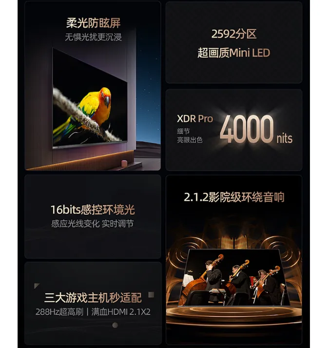 迩来,海信推出了100英寸新旗舰电视,各方面参数都飙到一个极高的范围。但现实上,这并不是市面上唯一的100英寸大屏旗舰,TCL恰恰也有一款,推出时间还更早一些。 那么,两款谁更强,我们大概不会买,但不妨碍相识下技能情况。 先看看海信的100E8N,售价18599元。 这款和《黑神话:悟空》有互助,属于官方定制电视,照旧很霸气的。 其具有2592个分区,峰值亮度4000nit,95% DCI-P3色域,非常彪悍。屏幕也是柔光防眩屏,具有16bit情况光感应混淆调光。支持4K 144Hz高刷,最高288Hz模式。 其采用了信芯AI画质增强芯片,提供AI画质增项,HDR动态出现,MEMC运动增强,控光强化等本领。 有2.1.2声道扬声器,共9个发声单位,包罗25W低音炮,总功率77W。 游戏上,支持最高品级的AMD FreeSync Premium Pro,三大游戏主机秒识别。同时对于黑神话也有优化,包罗色彩校准,杜比全景声增强,高动态范围调优等等,提拔游戏体验。 有4GB内存,128GB存储,双HDMI 2.1满血接口,WiFi 6,蓝牙5.3。总功耗580W。 而对手自然是TCL的98Q10K,98英寸,售价20999元。 这款98Q10K设置很靠近,也是2592个背光分区,峰值亮度3800nit,确实很靠近。不外TCL自己有量子点技能,以是色域到达了98% DCI-P3,照旧要高出不少的。同时面板是HVA低反射屏幕,提拔观赏体验。别的,TCL也利用了微距OD,收缩了背光层和面板之间的距离,控制了光晕。也是4K 144Hz高刷。 别的,采用了领曜芯片M2和TXR Mini LED画质增强芯片。音响方面为2.1.2声道,90W超大功率,低音单位为20W,共7个发声单位。独立功放芯片从3颗变为4颗,并支持T和弦,可以与覆信壁共同发声。 4GB内存,128GB存储,总功率480W。 可以看出,海信这款尺寸稍大,规格上和TCL的相称,不外没有量子点技能,色域上比TCL稍低一些。同时,TCL的功耗也是更低一些,相对峰值亮度稍低。 固然,这两款电视各人大概都不会买,毕竟太贵了,而且太大了,功能也太强了。不外TCL也有65英寸版的65Q10K,峰值亮度到达了3500nit,也不低,售价6999元。海信也有个65E8N-Pro,也是同级产物,可供参考。 总的来说,如今确实大屏幕,高性能电视非常昂贵,但假如屏幕尺寸降下来,代价也照旧低落许多的,各人可以按需参考,不消买那么大的。 |
