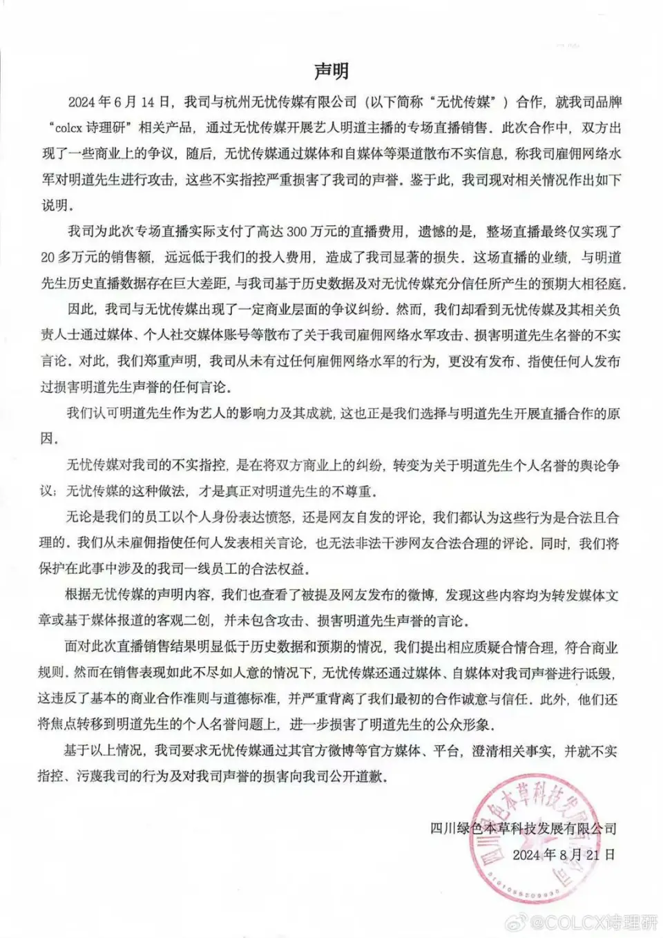 封面消息记者 周家夷 8月21日,针对克日明道直播间与诗理研品牌的直播带货纠纷,诗理研品牌所属的四川绿色本草科技发展有限公司(以下简称“绿色本草科技”)发布声明,体现从未雇佣网络水军发布任何侵害明道老师光荣的言论,并要求明道地点的杭州无忧传媒有限公司(以下简称无忧公司)澄清毕竟并公开致歉。 据相识,2024年“618”期间,品牌方绿色本草科技花费300万和明道地点的无忧公司互助专场直播,终极只有20多万销售额,未到达品牌方期望,并要求退还互助费用,目前两边未就退款诉求告竣同等。 根据此前报道,无忧传媒以为疑似本草公司员工的网友在明道视频下方批评,“对方试图以明星的光荣作为要挟,是非常不当的做法。” 8月6日,无忧公司曾发布声明回应称,从未作出任何情势的任何保量等答应,并在互助洽商阶段,与品牌方(绿色本草科技)委托的三方公司(亦师亦友)告竣共识。 |
