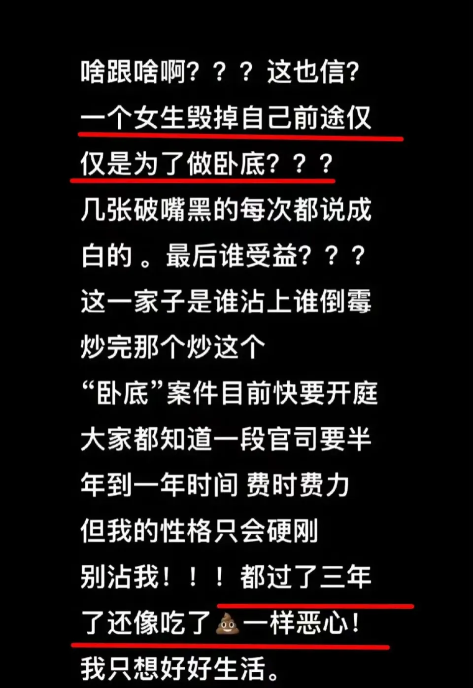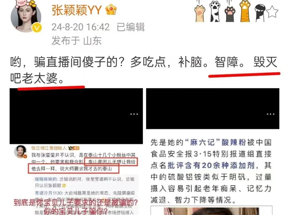 8月20日,张兰发布了一条视频,正式开撕张颖颖。视频里是狗仔葛斯齐的爆料,他说张颖颖是大S的卧底,当初大S汪小菲签仳离协议书的时间,汪小菲出轨的照片,是张颖颖给大S的。 葛斯齐还说张颖颖和大S不停有联系,表示现在终于水落石出了,统统都是她们做局。 张兰发布了这条视频后不久,在评论区留言,她说她不熟悉张颖颖,之前拍的谁人合照是上当了,以为她是粉丝才去合影。张兰用生命发誓,她之前与张颖颖没见过一面,都是上当已往的。 面对张兰的控告,张颖颖不甘示弱,各种晒图回怼。她转发了多位网友的截图,指出麻六记产物不过关,发霉有苍蝇,还有顾客吃了住进医院。 值得注意的是,之前汪小菲直播卖自家产物,他儿子吃了一口,汪小菲询问味道怎样,小孩童言无忌,形容像吃大便一样。 张颖颖喊话张兰,“三年了,还惹我?把炒作的心思放在产物上能更大更强”。 这还没完,张颖颖一连输出,她否认了卧底传言,说这都是张兰在颠倒优劣,谁沾上张兰汪小菲这一家子谁倒霉,过了三年还是像吃大便一样恶心。 张颖颖自曝她有5部手机,只想岁月静好不想腥风血雨,不想炒作不想要这种流量,谁在背后操控她很清晰。 除了回手张兰,张颖颖也提及了汪小菲,她骂汪小菲是孬种,喊话汪小菲是不是真想看她的手机。 她之以是骂汪小菲,是由于汪小菲去到张兰说不熟悉张颖颖,还称张颖颖是卧底的视频下面留言,这激怒了张颖颖,开始不停输出。 很快,张颖颖、张兰和汪小菲三人就登上了热搜,引发热议。有博主边吃瓜边总结,感慨张颖颖好疯,居然敢正面刚张兰。张颖颖直接已往留言,“对付疯子就是更疯”。 对于两人的“互撕”,评论区网友们各抒己见,有人询问张颖颖为什么预备5部手机拍人家,她答复是保命符,按照他家的品德反面会整她。 果然,如张颖颖所料,现在他们确实是“撕”起来了,她的评论区里有很多人支持她,以为谁有张兰这种婆婆谁的内心必须强大,还有人说分手见人品,都是他们先挑事的,张颖颖点赞了这些评论。 别的,还有网友说光荣张颖颖是荣幸的,幸免一场劫难,张兰一家嘴脸可骇,倒霉的大S和张颖颖幸好都出来了。张颖颖也点赞了这些评论,好像在为大S感到不平。 也有人提出质疑,以为张颖颖不应该针对张兰,话是葛斯齐说的,张颖颖回复说这是借刀杀人。看到有网友说麻六记产物没题目,张颖颖说对方是菲佣。 更有网友就张兰说不熟悉张颖颖的发言问她,张颖颖回复称是“天大的笑话”。 之前张颖颖就说过张兰有“两副面孔”,表面说不熟悉她,私下还叫过她宝贝儿,让她多关心汪小菲,现在撕破脸不认人,真是讽刺。 提及张颖颖,信托很多人都不生疏,她是汪小菲的前女友,还为他打胎过,但是两人终极弄得不欢而散。 除了张颖颖,张兰之前还“撕”过大S,晒了一堆截图当成“出轨证据”,遭到了不少网友的群嘲。 着实,汪小菲已经和马筱梅完婚了,无论是大S还是张颖颖,都是已往式了,张兰不停盯着这两个人不放,多少有些败坏好感,张颖颖爆粗口说脏话,也是一言难尽。 值得注意的是,登上热搜后,张兰立刻开播带货,似是引流炒作故意为之,张颖颖立刻拆台,又说产物有题目,并说,“毁灭吧老太婆”,否认所谓的不熟悉,再度飙脏话。 总之,感觉他们一家的故事非常复杂,双方各执一词,既然都分开了就各自安好吧。 |