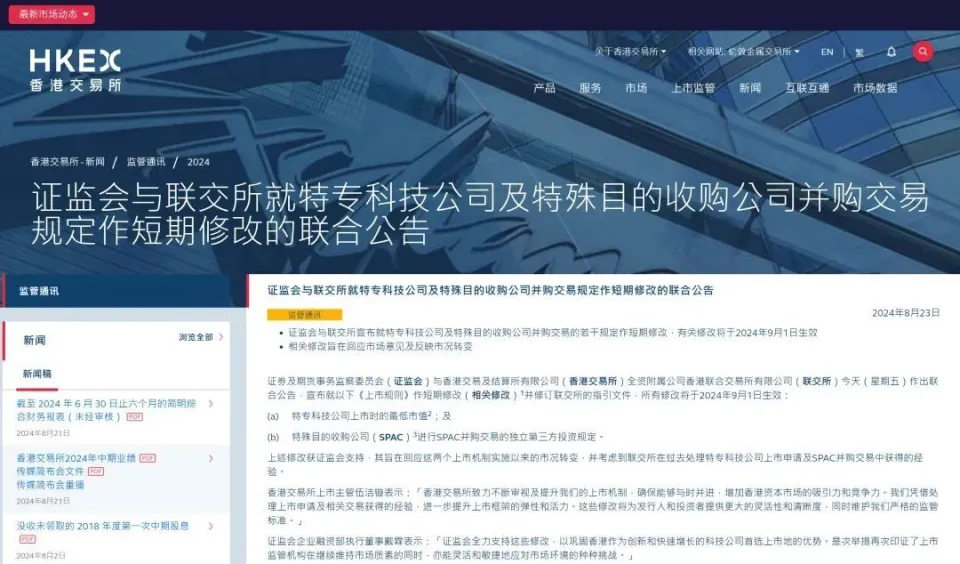 8月23日晚间,香港证券及期货事件监察委员会(以下简称“香港证监会”)与香港生意业务及结算全部限公司(以下简称“香港生意业务所”)发布《就特专科技公司及特别目标收购公司并购生意业务规定作短期修改发布连合公告》(以下简称《连合公告》)。 《连合公告》全部修改将于2024年9月1日收效,暂时实行三年,实行期至2027年8月31日止。2027年8月31日前,香港联交所或会按须要检验有关规定及进行公众咨询。 特专科技公司上市最低市值下调 根据《连合公告》,《主板上市规则》第18C.03(3)条下特专科技公司上市时的最低市值规定将下调。 详细下调幅度如下: (a)如为已商业化公司:由60亿港元减至40亿港元; (b)如为未商业化公司:由100亿港元减至80亿港元。 香港生意业务所表现,相干修改反映最新市况,并渴望可为有高增长潜力的新经济公司提供可行的上市途径。 SPAC并购生意业务门槛低落 根据《连合公告》,进行SPAC并购生意业务涉及的最低独立第三方投资额将调减至以下较低者: (a)《主板上市规则》第18B.41条所载现时规定有关投资金额相对SPAC并购目标议定估值所占的百分比; (b) 5亿港元。 与此同时,第三方投资者的独立性规定也有所放宽。 《主板上市规则》第18B.40条下SPAC并购生意业务的第三方投资者独立性测试将作出以下调解,使其与特专科技公司的资深独立投资者的独立性测试(第十八C章独立性测试)同等: (a)第三方投资者是否独立,将按该投资者对SPAC并购生意业务作出相干投资的终极协议签订之日以及直至继续公司上市期间作为评定基准; (b)以下人士不会被视为独立第三方投资者:(i)SPAC或SPAC并购目标的焦点关联人士,惟任何SPAC或SPAC并购目标的大股东仅因其对SPAC或SPAC并购目标的持股规模而被视为焦点关联人士者除外(受限于下文第(b)(ii)段); (ii)SPAC或SPAC并购目标的控股股东(或任何被视为控股股东的一组人士的其中一员);(iii)SPAC并购目标的开办人及其精密接洽人; (c)香港联交所保留按个别究竟及情况将任何其他人士视为非独立的权利。比方,与SPAC发起人或SPAC/SPAC并购目标的控股股东或SPAC并购目标的开办人签订了同等行动协议或安排的人士通常不被视为独立。 旨在增长香港资源市场吸引力 香港生意业务所表现,上述修改获香港证监会支持,目标是顺应这两个上市机制实行以来的市况变化,并思量到香港联交地点已往处理惩罚特专科技公司上市申请及SPAC并购生意业务中得到的履历。 香港生意业务所上市主管伍洁镟表现,香港生意业务所致力不停审视及提升上市机制,确保可以或许与时并进,增长香港资源市场的吸引力和竞争力。 泉源 港交所网站 |