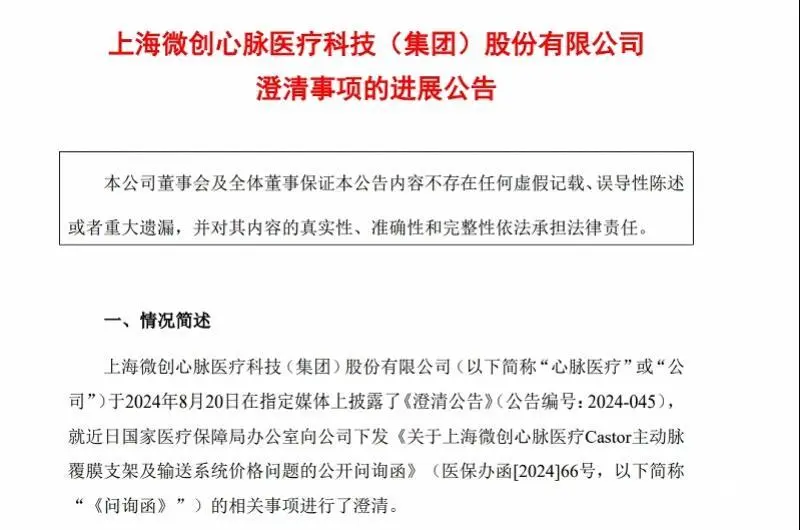 此前,国家医保局向心脉医疗发出的公开问询函表现,“经开端约谈沟通,你公司提出的代价调解操持仍有较高的代价风险”。因此,国家医保局要求心脉医疗公开回复四方面题目,包括是否存在不正当营销举动等。 在最新的澄清公告中,心脉医疗表现,公司决定将其Castor支架等系列胸主支架产品终端代价调解为7万元左右或以下,贬价幅度40%左右或以上,代价尺度与行业内同等。 图源:心脉医疗公告。 8月23日晚,心脉医疗公告,针对国家医保局对公司《问询函》的事项,公司及董事会第一时间构造相干职员对该事项的具体环境举行了核查,向国家医保局自动申请优化调解包括Castor分支型自动脉覆膜支架及输送体系(以下简称Castor支架)在内的胸自动脉覆膜支架产品代价,并向国家医保局办公室出具了《上海微创心脉医疗科技(集团)股份有限公司回复函》。 心脉医疗在回复函中表现,针对Castor支架代价题目所引发的社会广泛讨论与关注,向国家医疗保障局及社会各界表达最诚挚的歉意与深刻的反思。 在国家医保局此前对心脉医疗的一连“四问”中,第四个题目为,“Castor支架销售过程中是否存在通过署理商举高挂网代价、实验不正当营销举动,进而增加患者和医保基金负担等题目。” 对此,心脉医疗复兴称,“公司本身未引导及要求通过经销商举高挂网代价、实验不正当营销举动,不掌控渠道卑鄙具体环境。” 心脉医疗末了表现,连合行业实际环境,公司决定在根本不影响出厂代价和利润的环境下,大幅压缩流畅环节过高加价,“将Castor支架等系列胸主支架产品终端代价调解为7万元左右或以下,贬价幅度40%左右或以上,代价尺度与行业内同等。” 图源:心脉医疗公告 别的,心脉医疗也在公告中发布风险提示,Castor支架等系列胸主支架产品终端代价调解为7万元左右或以下,贬价幅度40%左右或以上,公司胸自动脉覆膜支架挂网代价已在各省自治区、直辖市等医保局、医药集采机构举行调解中。若经销商已有备货产品未来后续处置处罚不善、会商无法告竣同等、市场竞争加剧或发生其他不利因素等,公司大概面对经销商退换货风险、毛利率下降风险或其他相干风险等,从而对公司谋划业绩产生不利影响。对此,公司将积极推进并与相干方洽谈、商定后续事宜。 奥一消息统计发现,8月20日-8月23日,心脉医疗股价累计跌幅达16.22%。8月23日收盘,其股价为81元,市值为99.8亿元。 采写:奥一消息记者 林诗妍 |