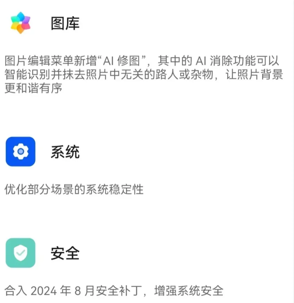 华为Pura70系列手机已经推送了鸿蒙4.2系统新版本升级更新增长了AI消除功能,通过AI消除功能可以智能辨认并抹去照片中无关的路人或杂物,让照片配景更调和有序。 在华为Pura70系列手机之后,如今华为Mate 60系列手机也推送了鸿蒙4.2系统新版本升级更新,增长了对AI消除功能的支持。 如今华为Mate 60系列手机推送了鸿蒙4.2.0.135新版本升级更新,推送的升级更新包巨细有536MB。 这次向华为Mate 60系列手机推送的鸿蒙4.2新版本升级更新首发是图库方面增长AI修图功能,为各人带来了等候已久的AI消除功能。 鸿蒙4.2新版本升级还修复了部分场景的系统稳固性,安全方面合入2024年8月的安全补丁,提升系统安全性。 华为Mate 60系列手机是华为的高端旗舰手机,在客岁的时间推出,硬件设置上搭载的是麒麟处理器,首发鸿蒙4.0系统,华为Mate 60系列手机硬件设置霸道,将支持纯血版鸿蒙系统升级更新。 |