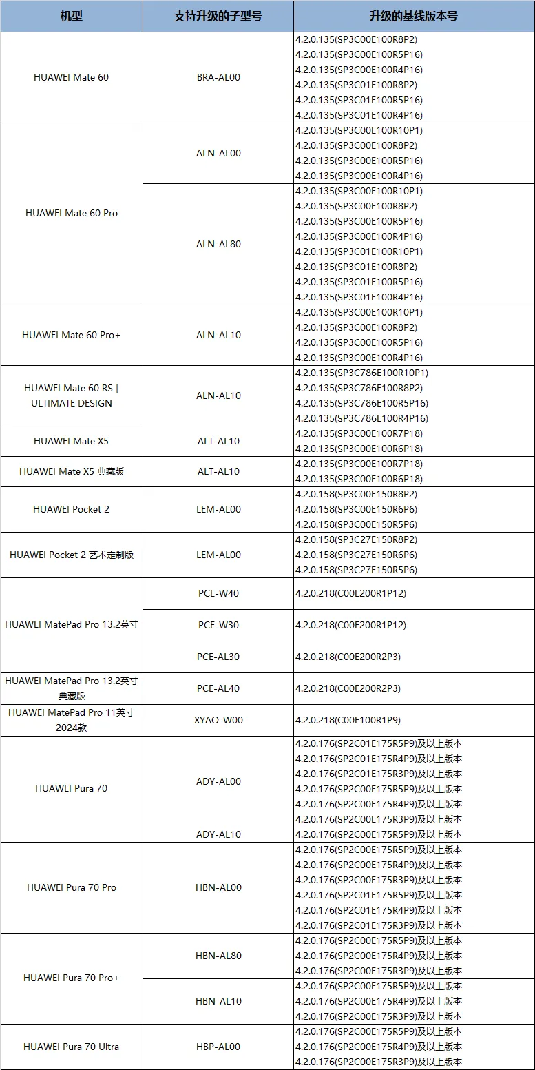 IT之家 8 月 26 日消息,华为本日在社区公布了支持在线升级 HarmonyOS NEXT Beta 版的机型及基线版本清单。 本日起,HUAWEI Mate 60 系列、HUAWEI Mate X5(含典藏版)、HUAWEI Pura 70 系列、HUAWEI Pocket 2 系列、HUAWEI MatePad Pro 13.2 英寸(含典藏版)、HUAWEI MatePad Pro 11 英寸 2024 款等 15 款(手机 / 平板)装备开启 HarmonyOS NEXT Beta 版用户招募运动。 官方称需得到入选资格后方可升级,具体用户招募运动页面官方已删除,IT之家会持续关注并带来跟进报道。 本次运动仅支持在中国大陆使用且符合基线版本的机型,IT之家附列表如下: |