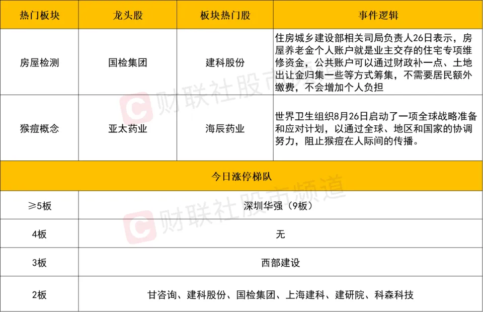 财联社8月27日讯,市场全天低开低走,深成指、创业板指均再创调解新低。盘面上,房屋检测概念股逆势大涨,华蓝团体、盈建科、建科股份、国检团体等多股涨停。ST板块震荡走强,*ST景峰、*ST同洲、ST目药、ST加加等20余股涨停。猴痘概念股表现活泼,海辰药业、亚太药业、合富中国涨停。银行股一度冲高,中、农、工、建四大行盘中再创汗青新高。下跌方面,华为海思概念股团体调解,世纪鼎利等多股跌超10%。总体上个股跌多涨少,全市场超4100只个股下跌。沪深两市本日成交额5115亿,较上个生意业务日缩量150亿。停止收盘,沪指跌0.24%,深成指跌1.11%,创业板指跌0.94%。 板块方面 板块上,房屋检测板块全天强势,华蓝团体、盈建科、建科股份、建研院、国检团体、上海建科、甘咨询等个股涨停。建科院、招标股份、启示计划等个股涨幅居前。消息面上,住房城乡建设部干系司局负责人26日表现,房屋养老金个人账户就是业主交存的住宅专项维修资金,公共账户可以通过财政补一点、地皮出让金归集一些等方式筹集,不必要居民额外缴费,不会增长个人负担。 机构表现,近期住建部表现将研究建立房屋养老金制度,并于部门都会开启试点,有望为房屋定期体检、安全管理提供稳固资金池,带动存量房检测、房屋质量保险评估等需求放量。 从市场角度来看,随着房屋检测概念一连炒作,资金开始向大基建团体举行延伸炒作,房屋计划、防水、电梯等各个细分方向均于盘中有所表现。但需留意的是,领涨的个股多数属于位置较低的小市值标的。故本质上而言仍属于超跌修复反弹的范畴之中。 猴痘概念股表现活泼,海辰药业、亚太药业、合富中国涨停。凯普生物、普利制药、透景生物、谱尼测试等个股涨幅居前。消息面上,近期天下卫生组织(WHO)启动了一项举世战略准备和应对计划,该计划涵盖2024年9月至2025年2月的6个月时间,预计必要世卫组织、会员国、相助搭档等各方共同筹集1.35亿美元的应对资金。 机构研报以为,由于如今国内尚未有猴痘疫苗上市,早发现早隔离早治疗仍然是防治猴痘疫情的有用手段。猴痘病毒检测试剂盒、猴痘疫苗、猴痘治疗药物干系企业仍有望于后市的题材轮动中反复活泼。 红利股方向本日再度活泼,中国银行、农业银行、工商银行、建设银行均于盘中再创汗青新高。而中国石化、中国石油、中国神华等个股同样逆势上涨。在缩量弱势整理的市场环境下,市场风险偏好再度降低,越来越多的资金选择抱团于红利股举行避险。以是在市场出现明确的领涨新方向之前,以银举动代表的红利股抱团炒作或仍将延续。但需留意的是,随着短线活泼资金的加入,干系个股的短线颠簸大概会进一步加剧,贸然追高的话风险收益比或相对较低。 个股方面 从个股层面来看,华为海思概念股跌幅居前,两大20CM的人气标的,力源信息与世纪鼎利双双跌超10%,好上好跌停。不过较好的是,连板高标深圳华强履历了全天放量分歧后于尾盘再度回封涨停,或为嫡资金的回流埋下伏笔。总体而言,华为海思在一连两日巨幅回调解理后,如今已来至较为关键的节点,若无法及时迎来强修复的话,短线退潮的概率将进一步提升。 而房屋检测概念本日进一步增强,板块中逾10股涨停或涨超10%,此中国检团体、甘咨询、建科股份、上海建科等均是连板涨停。而且扩散炒作至房屋计划、防水、电梯等各个基建细分方向,故在板块容量进一步拓宽后,该题材的延续性或更为值得等待。不过必要留意的是,由于市场增量资金的匮乏,板块热门的延续性始终相对较差,房屋检测概念履历了本日全线扩散后,预计嫡板块中个股的分歧大概会加大。 后市分析 本日市场延续弱势整理,三大指数全线收跌的同时,量能也再度萎缩,故在市场出现出放量拉升的转强信号之前,震荡筑底的布局仍将延续。而从短线题材端来看,市场热门仍旧维持快速轮动。科技股方向再度陷入调解,此前最为活泼的消耗电子、华为海思等题材更是跌幅居前。而另一方面,房屋检测概念进一步走强,并全面扩散至基建板块。可见如今短线活泼资金仍旧偏好尚处于低位、市值较小的题材或个股之中。别的,邻近月末,个股中报业绩暴雷风险以及基金赎回压力或将加剧,以是设置性资金站在安全角度考量,更多选择抱团于确定性红利方向。 随着科技股方向团体陷入调解,本日短线感情指标再度回落,全天于0轴线附近震荡。 市场要闻聚焦 1、TCL中环公布硅片涨价 两大龙头同日调价 财联社8月27日讯,记者8月27日获悉,TCL中环将对外调涨硅片代价,调解后,G10N 1.15元/片,G12RN 1.3元/片,G12N 1.5元/片。稍早前,隆基绿能也向记者证实硅片将涨价,此中N-G10L报价为1.15元/片,N-G12R报价为1.3元/片,新报价匀称上调5分/片 2、国家数据局:公共数据、企业数据两份开辟使用文件年内出台 财联社8月27日讯,记者本日(27日)从国家数据局最新相识到,有关公共数据、企业数据资源开辟使用的两份文件将于本年年本地续出台,个人数据资源开辟使用的干系政策也在加紧研究当中,未来将通过更有针对性、更具操纵性的政策指引,让企业有感、市场有感。国家数据局表现,党的二十届三中全会初次提出造就天下一体化数据市场,并就加速建立数据干系制度规则提出了明确要求。如今,国家数据局正在分类施策推进数据资源开辟使用。 |