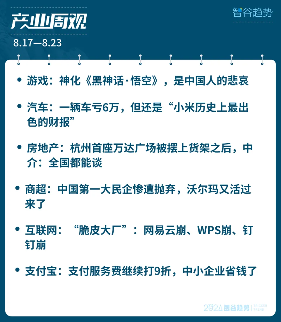 作者 | 智谷财产组 智谷趋势出品| ID:zgtrend 神化《黑神话·悟空》,是中国人的悲痛 打磨四年,游戏科学交出了一份良好的答卷。 游戏质量足以开中国3A之先河的同时,游科只是一家规模不敷100人,从无3A大作开辟履历,大本营阔别杭州市中央的一家小厂,再加上“终于能饰演我们本身的超等英雄”如许的情怀加持,游科配得上泼天的流量和富贵。 但如果只从游戏角度,我会以为IGN总部的8分,是更加客观中肯的评价:很好,但还不敷好。 缺乏更有深度的舆图计划,人物动作和心情稍显僵硬,boss动作交互尚有短缺...而这统统,都因为我们还没有成熟的3A游戏工业体系。没有它的加持,就像市场上偶然大概会出现一部《流浪地球》,但紧接着的大概率就是《上海堡垒》。 对如许的现实,很多人都选择性失明白。这就导致《黑悟空》更像是一块照妖镜,让各路妖妖怪怪都显出了本相。 第一拨人,他们喜欢把任何东西都扯上弘大叙事,容不得你说《黑悟空》的半点浮名。我如今十分能明白IGN中国给出10分背后的求生欲了,如若不然,他们面对的大概率是“你要毁了中国游戏行业吗”的灵魂诘问。 这帮人最常用的话术,就是“引发了老外的《西游记》学习潮”,“真正的文化输出”,一通话术猛如虎,一看steam上的外文评价人数: 说真的,这“学习潮”的人数能不能凑出一个连都很难讲。 第二波人,我愿称他们为贸易鬼才。打磨四年的作品,这帮人似乎已经看到工业化流水线生产的潜力了。 《黑悟空》的经济效益确实可观,上线首日就能卖出450万套,销售额高达15亿。高盛研究的最乐观环境是销量将凌驾2000万套,营收有望突破60亿。这已经远超半数A股上市公司2023年的营收了。 于是几乎一夜之间,你能看到各路国产3A纷纷冒头。什么代号《锦衣卫》、《猿公剑:白猿觉醒》,层出不穷。 说真话,如果这些游戏质量上乘,那固然是功德。但如果只是为了杀进游戏市场割一波韭菜,那真不如干脆点叫《黑神话·悟能》算了。 第三波人,我愿称他们为流量的神。游科的高层杨奇曾经发过一条微博,此中说到不必要女性玩家来反向动员,不照顾那些为了泡妞而来的淫虫。 我不知道这条微博是怎么被当成“性别藐视”、“辱女”的,但《黑悟空》诞生至今,这些荒诞魔幻的争议就从未停过。 我只能说,极端女权们和一些自媒体们,是懂怎么引爆市场情绪的。 照出这三波人,是《黑悟空》为厥后者们提供的履历:得到贸易乐成之后大概变得浮躁,那里有热度就奋掉臂身地冲向那里。 《黑悟空》很好,但神话它,是中国人的悲痛。 一辆车亏6万,但照旧“小米历史上最精彩的财报” 小米汽车卖一辆亏6万,但雷军说:“(二季报)是小米历史上最精彩的财报”。 8月21日,小米公布了2024年Q2财报,初次披露了汽车业绩。数据表现,报告期内,小米汽车销售收入62亿元,净亏损紧缩至18亿元。 大略计算,小米单车亏损就有6万多元。 原来造车前期亏钱不是什么大事,今天能红利的特斯拉、理想、比亚迪不都是一起亏过来的,但没想到极越汽车高管却抓着小米造车亏钱的点不放,怒骂雷军是在搅乱市场。 但要我说,要是小米汽车一上来就大赚特赚,这才更会可骇吧。 况且,从毛利率上看,小米汽车毛利率15.4%,凌驾了同期特斯拉汽车销售的毛利率(13.9%)。同样凌驾国内浩繁友商。 高毛利率来自于三个缘故原由。 第一是小米供应链管理本事。和比亚迪一样,小米造车也是走向上垂直整合套路,通过前期投资供应商,来得到更大的自动权和议价权,压低供应链资本。 第二是小米一步到位,直接自建工厂。跳过代工生产的环节,固然前期买地、买设备、建厂费用高,但后期将不停摊薄资本。 第三是供应商看好小米,提前给予了资本开释。二季度小米交付2.7万辆新车,年交付保底10万辆、冲刺12万辆的目标不变。SU7上市后的第五个月,周新增订单仍在3000-5000辆。市场行情好,供应商备货规模就起来了。 从毛利率方面来看,如果能不停保持这一水平,扭亏为盈的拐点不会太远。但从小米汽车的操持来看,后续还将加速销售门店建立。由于新车研发,小米汽车策划付出、研发和销售推广费用都有所扩大。加上纯电车是全部新能源车中资本最高的车型,前期投入只会越来越高。 但别忘了,小米汽车亏钱了,小米手机和IoT业务照旧可以大概源源不停的创收,再支持雷军“末了一次创业”。 毕竟造车,一点都没延长小米挣钱。 杭州首座万达广场被摆上货架之后,中介:全国都能谈 王健林的断臂求生,还在继承。 智谷趋势8月22日获悉,万达在杭州落地的首个贸易项目杭州拱墅万达广场被摆上货架,报价14.8亿元,可以再谈。 拱墅万达算得上是老王旗下最优质的资产之一了。2013年,万达以14.26亿元竞得该地块,2014年拱墅万达正式开业,一至五层出租率高达100%,常年人流如织,受欢迎水平不亚于如今的胖东来。每年的年租金收入高达1.09亿。 从这个角度看,这个报价以致都不能覆盖当年万达的拿地资本,拱墅万达真算得上是“甩卖”。很明显,对急于变现的老王来说,可否卖个好代价已经成了一个次要问题。 这实属无奈,毕竟万达尚未走出困境。2024年一季度,万达商管只有货币资金124.81亿元,短期乞贷27.84亿元,恒久乞贷943.57亿元。尚有53.92亿元的存量债券尚未兑付。 颇有些心伤的是,不止拱墅万达这一核心项目,有中介透露称,全国范围内的万达广场均可谈价。 问