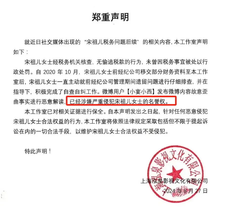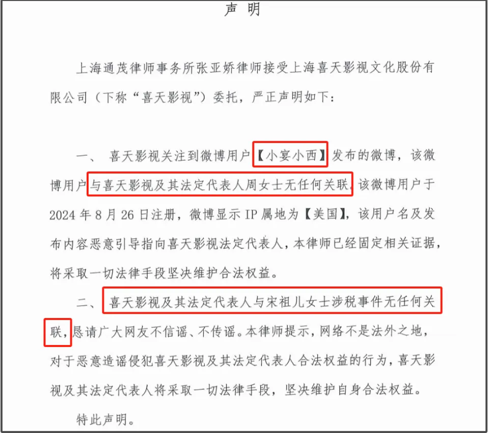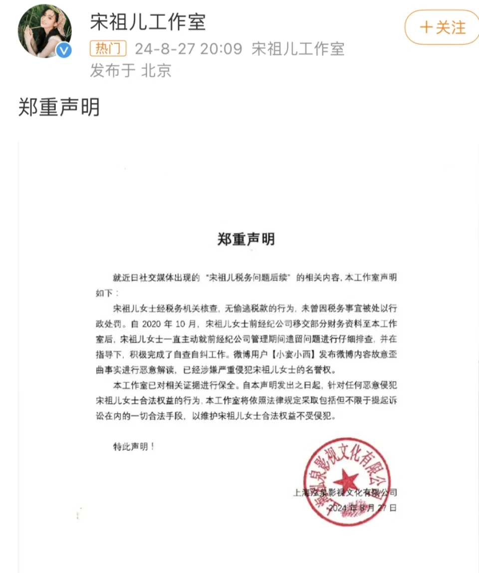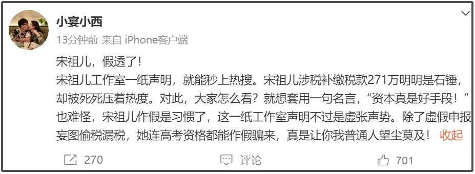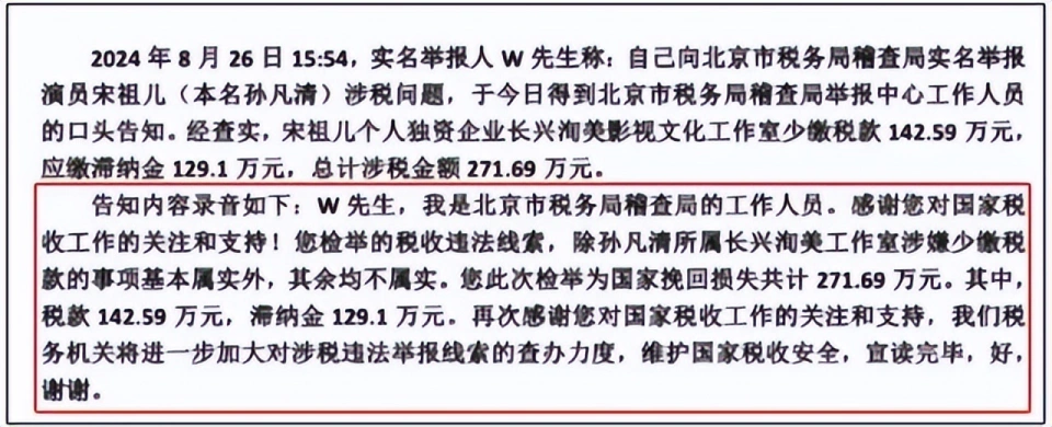 26岁女星宋祖儿被举报偷漏税风波,再次掀起了热度。 先是举报人晒出了疑似税务机关针对宋祖儿偷税漏税的回复,表现宋祖儿涉嫌少缴税款情况基本属实,检举人为国家挽回损失共计271.69万元。 但是相干话题并没有可以或许上热搜,反而是随后宋祖儿工作室的回应,火速上了热搜。 宋祖儿工作室针对爆料人“小宴小西”指控,直接举行了否认。表现宋祖儿经税务机关核查,无偷逃税款的行为,还称没有因为税务事件被处以行政处罚。 而前经纪公司喜天的遗留题目,宋祖儿也积极共同,完成了自查自纠。 也就是说,宋祖儿自查自纠,没有主观偷漏税,也没有被行政处罚的记载,某种程度就意味着她大概不会凉凉。但是也有网友以为,风波发生一年了,宋祖儿当时不发声不否认,如今才来发声,是不是阐明某些事已经搞定了,不怕再被查了。 尚有仔细的网友发现,宋祖儿工作室称爆料人歪曲毕竟恶意解读,维权名头又是光荣权,而诽谤罪,阐明爆料人说的情况大概存在一部分真实性。 随后,爆料人“小宴小西”火速回应,在宋祖儿发声之前,她就称该事件被压热度了上不了热搜,自己尚有大瓜要放。在宋祖儿工作室发声之后,她更是直接转发扬言“十点见”,暗示要曝瓜。 紧接着爆料人发文,但内容并非税务相干的事,而是指控宋祖儿母亲行贿,宋祖儿本人涉嫌高考作弊。 爆料人指出,宋祖儿前经纪公司喜天帮宋祖儿找到了河北教育厅或人员,宋祖儿母亲行贿让对方资助开了假的学历证实,拿到了她本不应有的天津高考资格,涉及行贿和高考舞弊行为。 爆料人同时晒出了相干证据,以及喜天副总杨静跟教育厅某处长的谈天对话,以此证实自己所言不假,双方存在长处往来。 行贿教育厅人员以及高考作弊是大雷,宋祖儿还没有回应,各人只能先吃瓜。而爆料人也接连发文痛批宋祖儿,工作室声明就能秒上热搜,涉税补缴271万却被死死压住热度,直言资源妙本领:“除了虚假申报妄图偷税漏税,她连高考资格都能作假骗来,真是让你我平凡人瞠乎厥后!” 此前爆料人“小宴小西”被指疑似喜天总司理周宴西,如今喜天公司也发声明澄清,称该微博用户并非总司理周宴西,间接否认了爆料者为喜天内部。 但是如今曝出的内容和宋祖儿涉税风波,都牵连到了喜天公司,很难一句“无关”就能澄清。如今喜天的批评区已经陷落,网友纷纷诘问高考作弊的怎么回事,同时号令北电和相干方举行观察。 看到这里,也是令人唏嘘。娱乐圈水深,明星艺人更应该洁身自好。宋祖儿如今就算不会凉凉,也已经成为了风险艺人,就希望她能早日回应作弊和行贿争议吧。 本文未经授权严禁转载违者必究! |