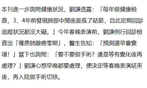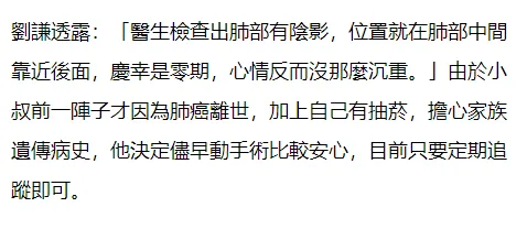 48岁刘谦患肺腺癌,他证明春晚后立刻入院手术,小叔比年因癌去世 8月28日,台媒爆料刘谦患上癌症,他受访证明确诊肺腺癌,2月份完成手术。 刘谦接受台媒采访,表现每年会做查抄,三四年前发现肺部长告终节,此前定期回诊并无大碍,但在本年上春晚前夕,确诊肺腺癌零期,大夫告知早晚会变坏,要刘谦做盛情理准备,刘谦非常果断,完成春晚后入院开刀手术。 刘谦表现自己很荣幸,由于阴影在肺部中间靠近后面,而且发现早是零期,心情没有那么极重,爆料小叔前一阵子才由于肺癌离世,自己有吸烟,眷属又有遗传病史,所以尽早手术比力安心,目前只要定期追踪即可。 刘谦的太太王希怡非常心疼,但看到刘谦对癌症的态度,直言他“头脑有题目”,由于刘谦还通过短信告知好友,直言患癌是人生体验,妈妈则非常告急。 据悉,刘谦完成手术后留在家中休养,8月23日加入《我的发展》录制,他的精神状态不错,但由于恒久在大陆工作,相隔15年回台湾录制综艺,稍微有点告急,对于台媒的采访,刘谦没有排挤,自动透露患癌。 刘谦本年六度登上春晚,险些完美完成把戏演出,不外在见证古迹的时刻,主持人小尼有一个失手瞬间,反而全网爆红,刘谦厥后受访表现,把戏不会由于失败而不完美,人总会做错,他客岁在北戴河演专场 60 场,就经历无数次失败。刘谦表现失败只会尴尬而已,并没有太严峻,而且歌手也会走音,人不是呆板,不可能完美。 刘谦不光吸烟,在疫情期间由于压力,每天都过得很忧郁及消沉,当时他为了支持公司的巨大开支进入直播界,起初非常抗拒,所以每天心情都欠好,做了一年才徐徐好转。 作为一名把戏师,刘谦非常清静,以为自己以后可以或许以“我是一个得肺腺癌的人”为由,拒绝喝酒及自己不想做的事故,而且刘谦积极工作,8月20日还在成都巡演,此前并未告知患癌。 末了,祝他早日病愈。 |