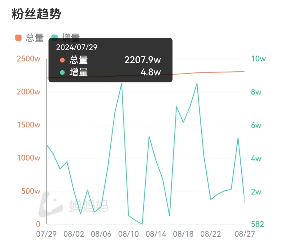 三言科技8月28日消息,今日,与辉偕行独立运营已满一个月。 据蝉妈妈数据体现,独立一个月以来,与辉偕行直播65次,场均观看人次601.9万,累计场观3.91亿次,场均销量10万至25万,总销量超100万,场均贩卖额1000万至2500万,总贩卖额1亿。 而另据达多多数据体现,已往30天与辉偕行直播贩卖额高出7亿。 粉丝方面,已往一个月,与辉偕行粉丝量从7月29日的2207.9万增长至8月27日的2305.6万,增量将近100万。 已往一个月,董宇辉个人账号粉丝量也从7月29日时的2679.8万增长至8月27日的2691.2万,增量11.4万。 |