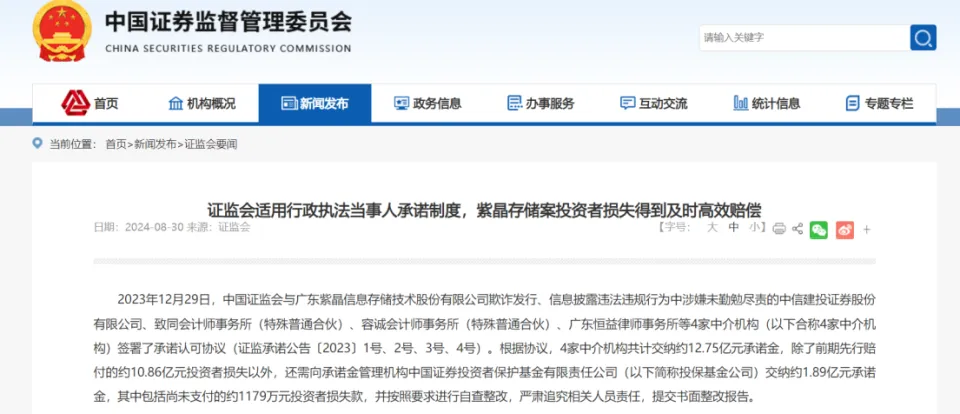 财联社8月30日讯(记者 高艳云)8月30日,证监会正式披露对案涉紫晶存储的四家中介机构的行政执法当事人答应协议推行公告,制止目前,中信建投、致同管帐师变乱所、容诚管帐师变乱所和广东恒益状师变乱所等已向投保基金公司交齐答应金,并举行了自查整改,证监会举行了现场核查验收。 鉴于4家中介机构已经推行答应认可协议,根据相干规定,证监会于8月30日依法终止对4家中介机构上述事项的观察。 证监会指出,该案作为2019年《证券法》修订后首例实用行政执法当事人答应制度的案件,对峙以人民为中心,较高服从地保护了投资者正当权益,充分体现了行政执法当事人答应制度在接济、惩戒、教育、化解市场抵牾纠纷等方面的综合性作用。 该案通过行政执法当事人答应制度督促当事人积极赔付投资者损失。后续,投保基金公司还将依照规定发布相干公告,在前期先行赔付中未申领赔偿金的适格投资者可以继承向投保基金公司申领相应的答应金赔偿。在实用行政执法当事人答应制度维护投资者正当权益的同时,4家中介机构也付出了总计约12.75亿元(为其业务收入的10倍多)的经济代价,并按照要求举行了整改。 证监会表现,下一步,将果断贯彻落实中心金融工作集会精力和新“国九条”要求,确保羁系“长牙带刺”、有棱有角,连续加大对资源市场违法违规行为的打击力度,强化中介机构把关责任,践行金融为民理念,依法依规稳慎做好行政执法当事人答应工作,更加有用保护投资者特别是中小投资者正当权益,推动资源市场高质量发展。 案涉科创板首批造假企业紫晶存储 前期,证监会对紫晶存储科创板IPO敲诈发行、信息披露违法违规行为作出了行政处罚,对相干责任职员作出了行政处罚以及市场禁入,并将涉嫌刑事犯罪职员依法实时移送公安构造处理(现查察院已经批捕),对“首恶”举行了严肃惩处,全方位追责。 同时,证监会对中信建投、致同管帐师变乱所、容诚管帐师变乱所、广东恒益状师变乱所四家涉案中介机构(以下合称四家中介机构)开展了相干观察工作。四家中介机构向证监会提出了实用行政执法当事人答应制度的申请,证监会依法予以受理。2023年12月29日,证监会分别与四家中介机构签署了答应认可协议。 相干中介机构已积极通过先行赔付,高效、高质量完成投资者正当权益的保障。 先行赔付工作在两个月内高效、高质量完成,累计申报有用赔付金额约10.86亿元,占总赔付金额比例98.93%,申报有用赔付人数16986人,占总赔付人数比例97.22%。 申报人数、赔付金额及投资者息争率均为历次先行赔付工作中最高,各项工作安稳完成并取得了精良工作成效。紫晶存储先行赔付实现了行政执法和民事赔偿的有用连合,节流了司法资源、进步了执法服从。通过快速赔偿投资者损失,在前端实时化解相干民事纠纷,实现法律效果与社会效果的同一。 在证监会分别与四家中介机构签署答应认可协议的公告中,证监会对四家中介机构明确提出了缴纳答应金和自查整改的要求。 答应金方面,扣除前期已通过先行赔付程序赔付投资者损失信10.86亿元,四家中介机构还应当交纳答应金合计约1.89亿元,包罗根据四家中介机构涉嫌违法行为的情节及结果等因素,其依法大概被处以罚款、充公违法所得的金额合计约1.77亿元,以及在先行赔付中适格投资者未领取的损失金额1179万元。 自查整改方面,证监会要求四家中介机构要“按照中国证监会提出的整改要求举行自查整改,严肃追究责任人责任并接纳内部惩戒步调,强化合规风控管理本领,切实进步执业质量”的要求。据相识,此次证监会披露行政执法当事人答应协议推行公告前,已完成对四家中介机构核查验收工作。 证监会立体化追责加码,惩防财政造假体系升级。 2024年是全面贯彻落实党的二十大精力的关键之年,是深入实行“十四五”规划的攻坚之年。上半年,证监会对峙以习近平新期间中国特色社会主义头脑为引导,认真贯彻中心经济工作集会、中心金融工作集会精力,全面落地《国务院关于增强羁系防范风险推动资源市场高质量发展的若干意见》要求,认真落实《关于进一步做好资源市场财政造假综合惩防工作的意见》。连合行政执法工作新形势、新特点,突出强本强基、严监严管,以高质量执法护航资源市场防风险、强羁系、促发展各项工作。 上半年,证监会核办证券期货违法案件489件,作出处罚决定230余件、同比增长约22%,惩处责任主体509人(家)次、同比增长约40%,市场禁入46人、同比增长约12%,合计罚没款金额85亿余元、超已往年整年总和。 严肃追究共同造假“第三方”责任 天下管帐名家黄世忠教授以紫晶存储案件为例,深入分析了中介机构未能发现财政造假的缘故起因,并以为第三方共同财政造假既是上市公司财政造假屡禁不止、频频得逞的紧张缘故起因,也是导致审计准则频繁失效、审计失败频频发生的紧张缘故起因。 克日,国务院办公厅转发的证监会、公安部、财政部、中国人民银行、金融羁系总局、国务院国资委《关于进一步做好资源市场财政造假综合惩防工作的意见》提出,供应商、客户、中介机构、金融机构品级三方职员共同实行财政造假构成犯罪的,依法果断追究刑事责任。 别的,相干部分还将分条理加大对第三方共同造假的打击,破除造假“生态圈”,包罗加快出台上市公司监督管理条